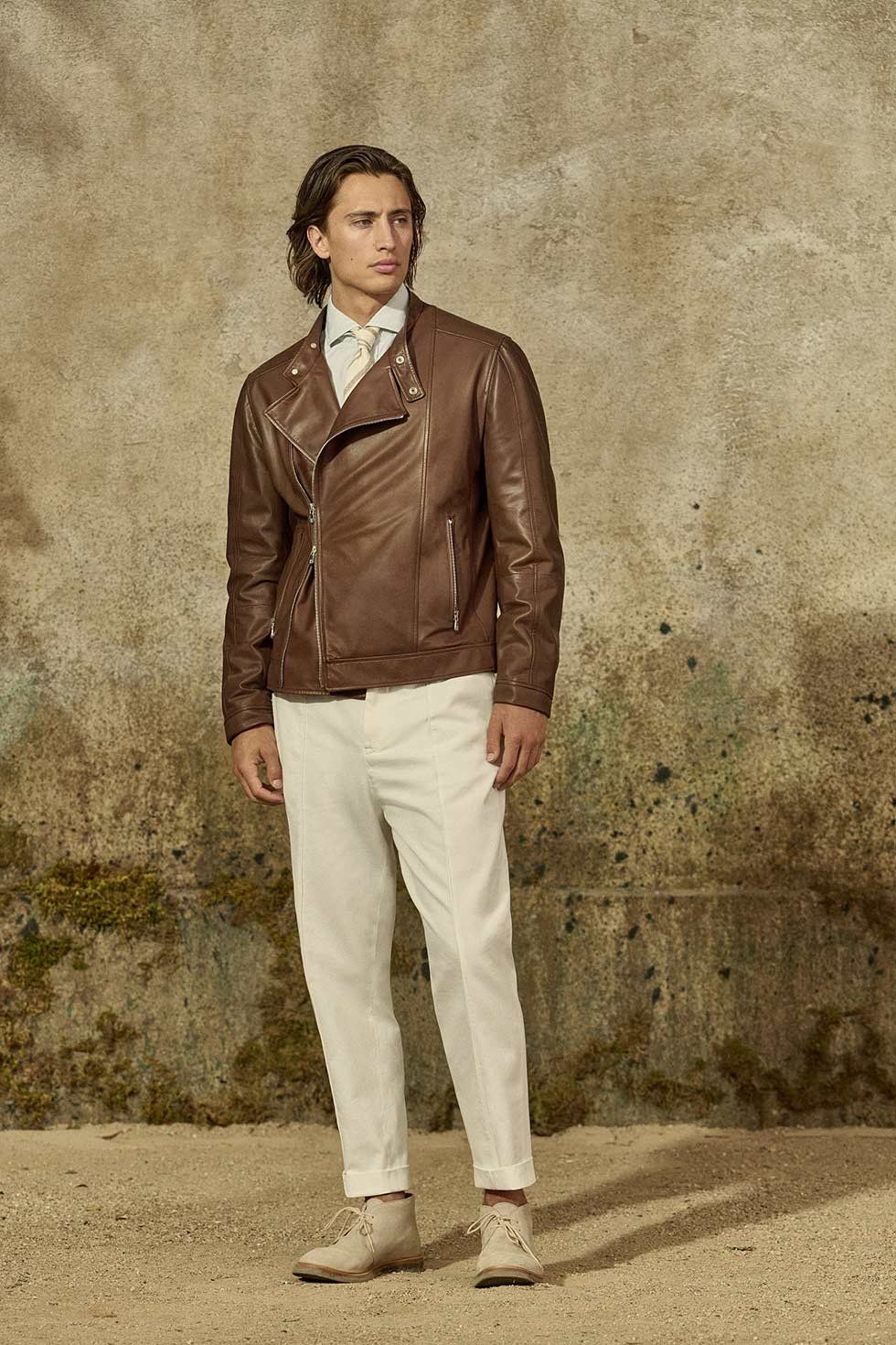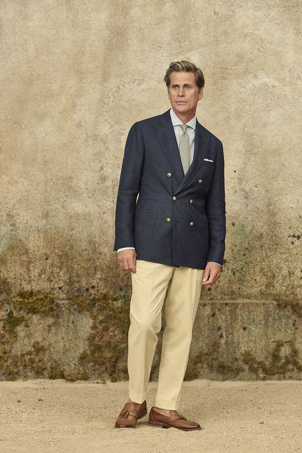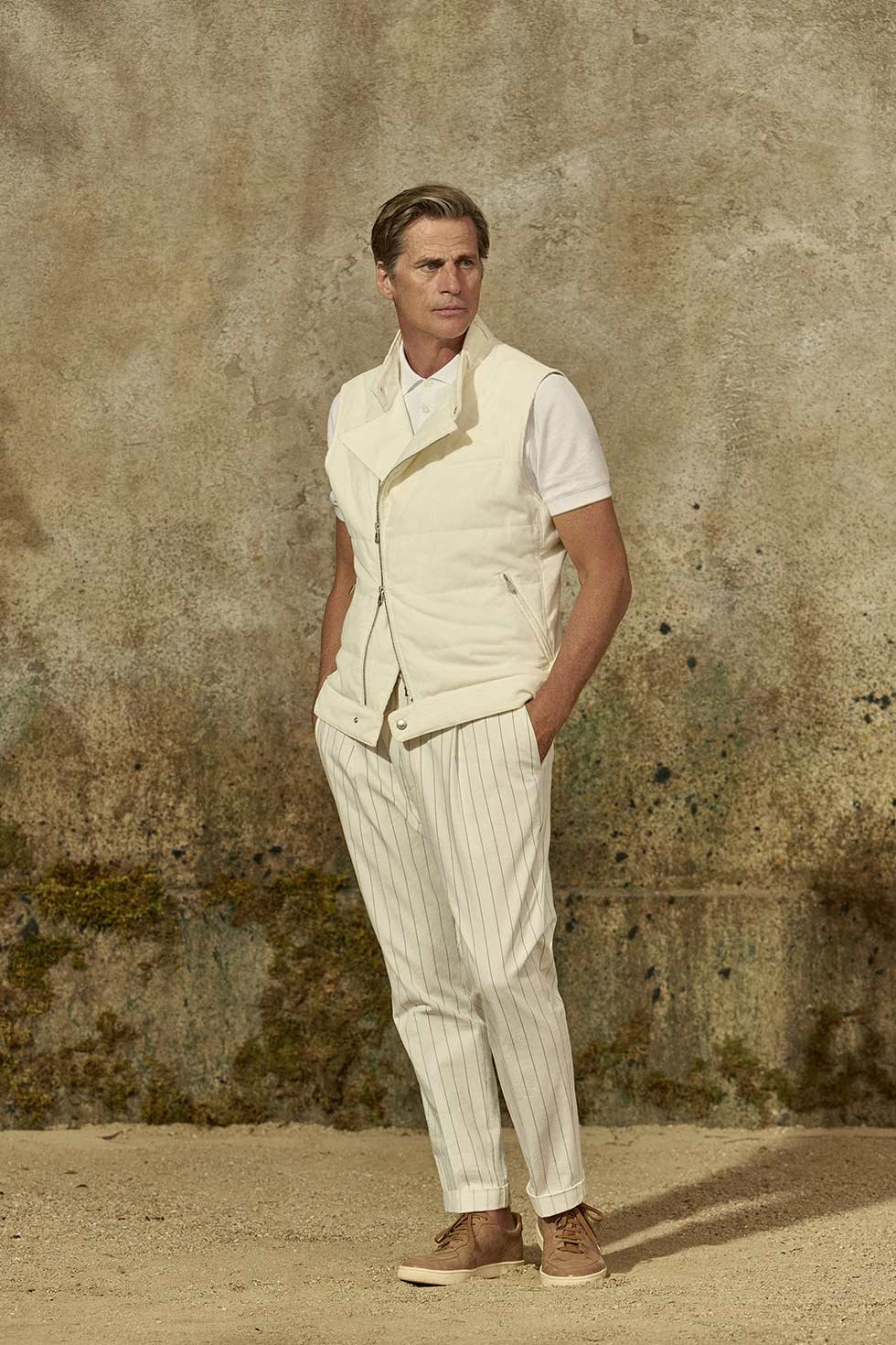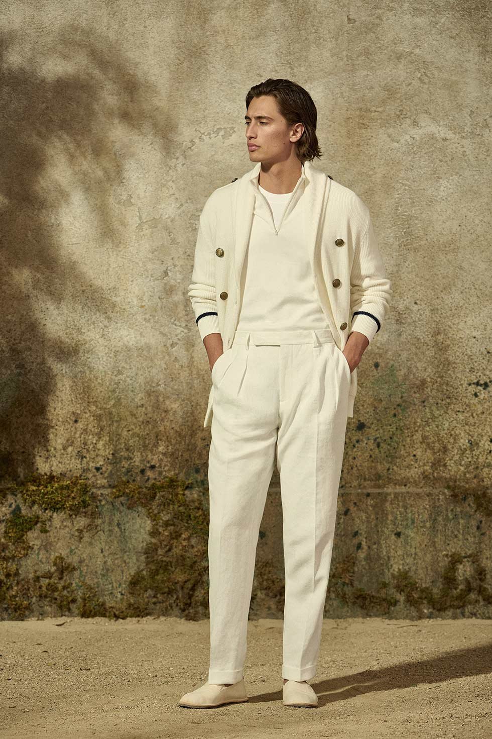 En algunas prendas vemos chaquetas de lino deconstruidas con bolsillos de parche, que se usan sobre pantalones lavados con pinzas sutiles.
