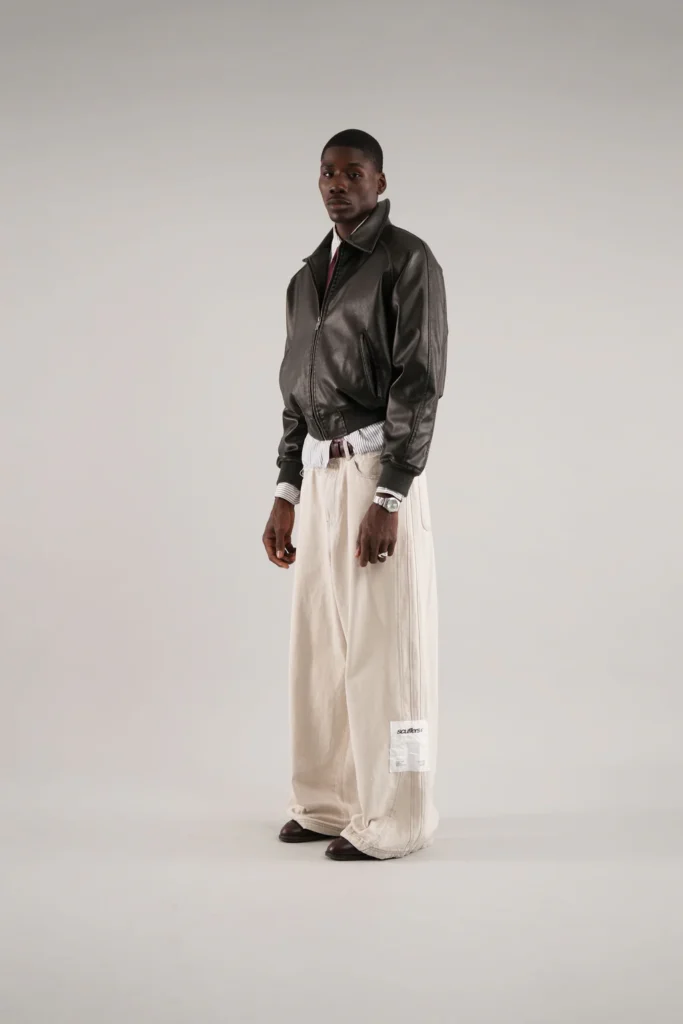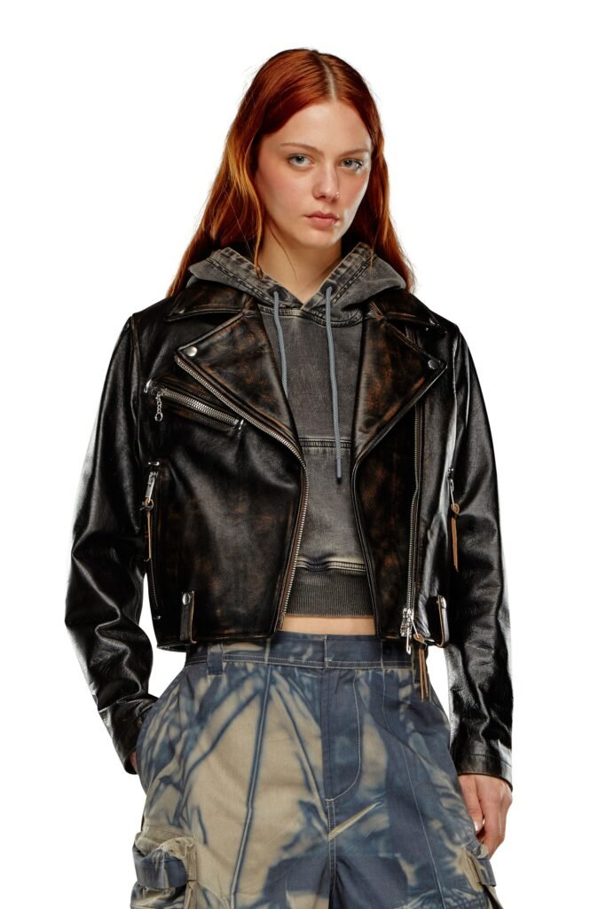 Un diseño tipo biker hecho de piel envejecida para revelar tonos marrones. La silueta oversized y ligeramente cropped es un tributo perfecto a la estética noventera.