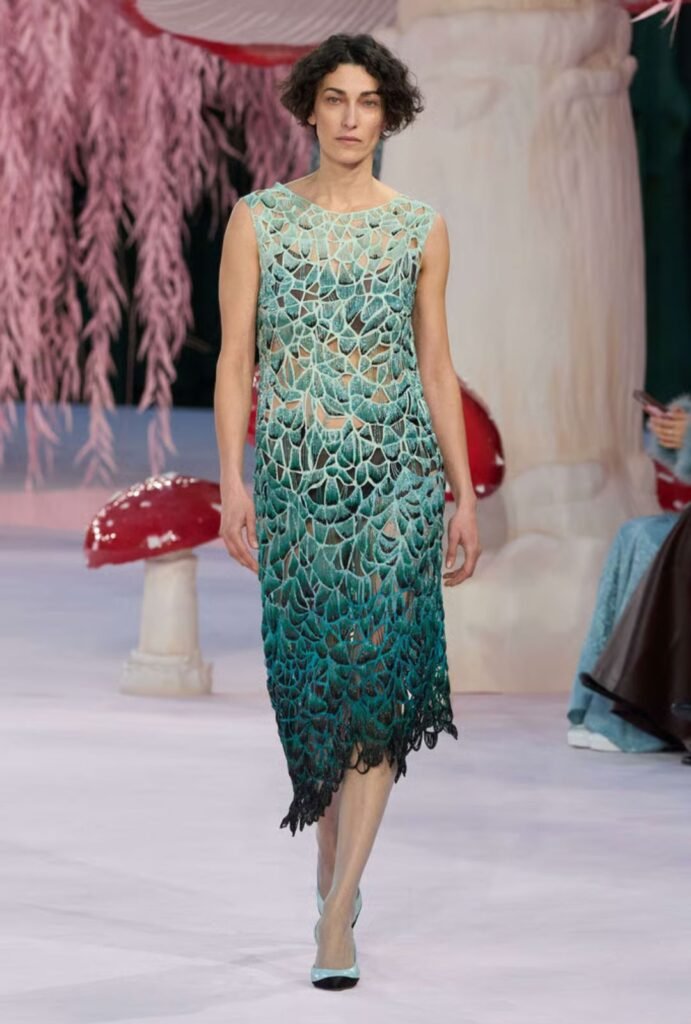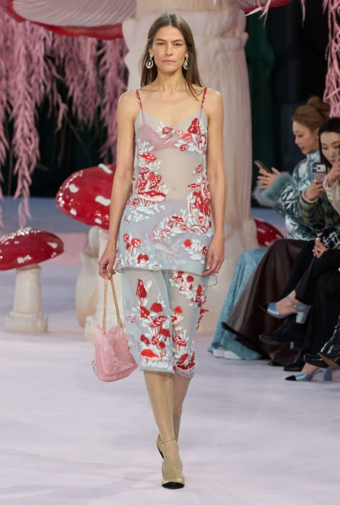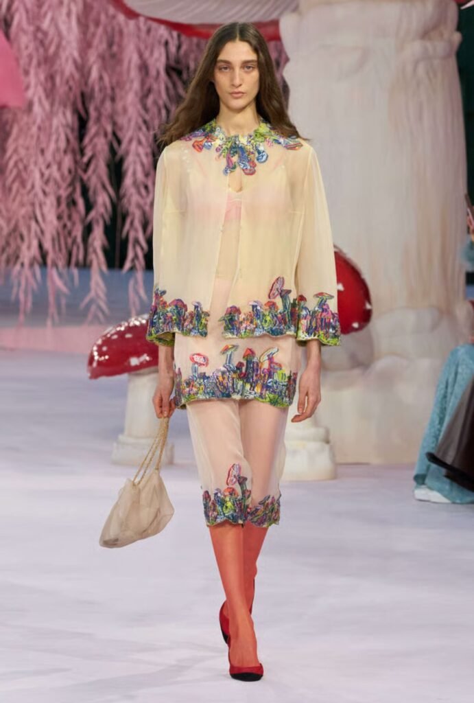 La pasarela se transforma en un ecosistema surrealista, donde setas gigantes, sauces rosa caramelo y alfombras rosa chicle crean un escenario casi de cuento. Blazy construye un relato donde la naturaleza y la fantasía se cruzan, y donde cada prenda parece cobrar vida propia, flotando entre el decorado y la luz tenue de un París húmedo de septiembre.