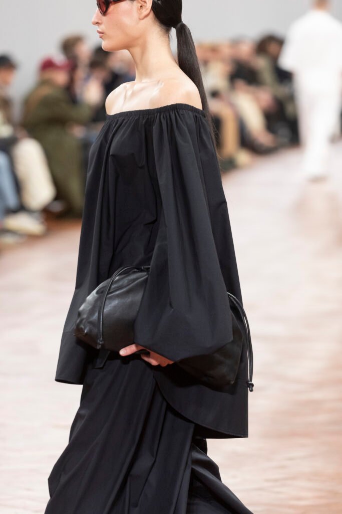 COS Atelier, una colección que sigue caracterizándose por sus finos tejidos y su impecable atención al detalle. Los looks más llamativos incluyen hombreras plisadas a mano, faldas de cola de pez y maxilongitudes fluidas, mientras que la sastrería y las prendas de punto se redefinen mediante mangas híbridas alargadas y solapas plegadas hacia dentro.