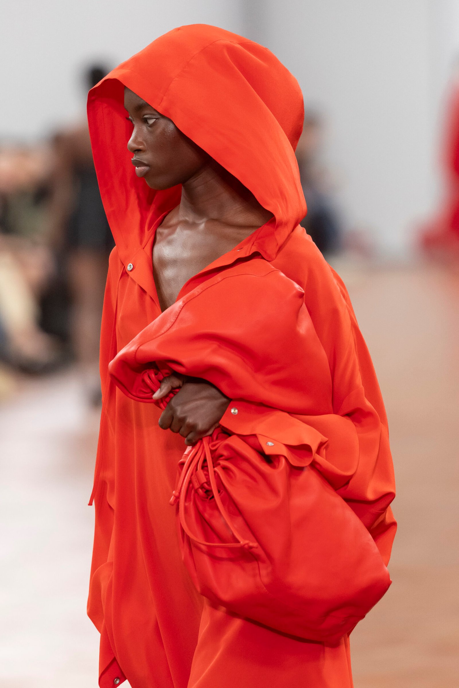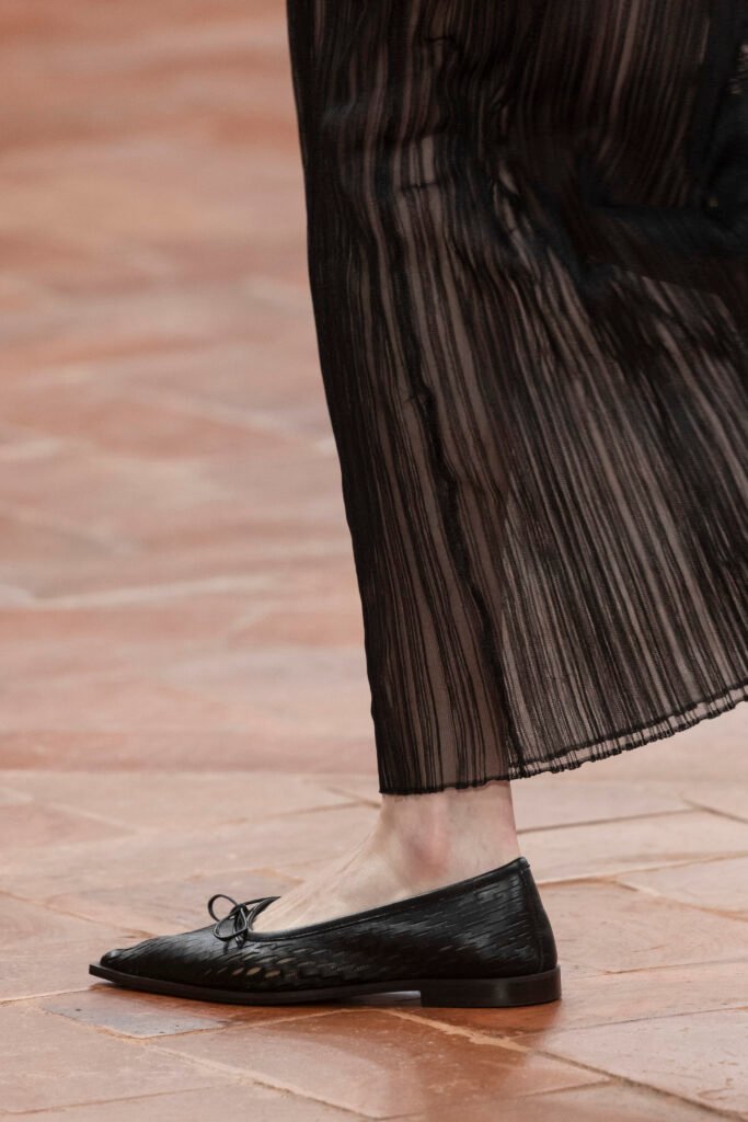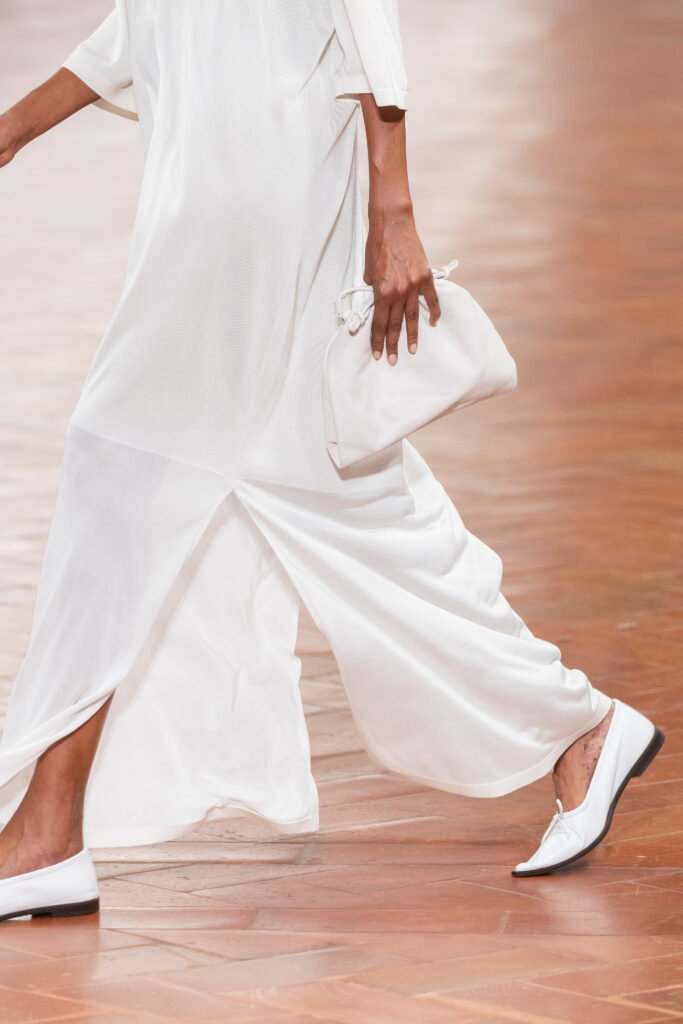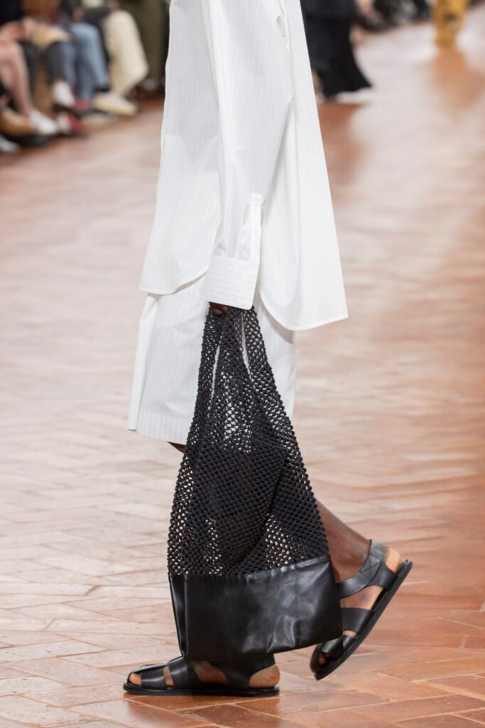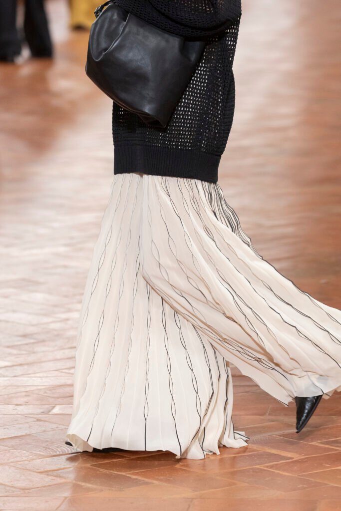 La experimentación con la técnica, la manipulación y el corte de los materiales realzan la textura de la superficie de las chaquetas de cuero, las bailarinas y los mocasines. Los pantalones de pata ancha plisados, confeccionados con moldes de papel hechos a medida, presentan bordes pintados a mano que crean profundidad y movimiento fluido. Investigando la materialidad de la luz, COS experimenta con la infusión de color a través de materiales y superficies translúcidos.