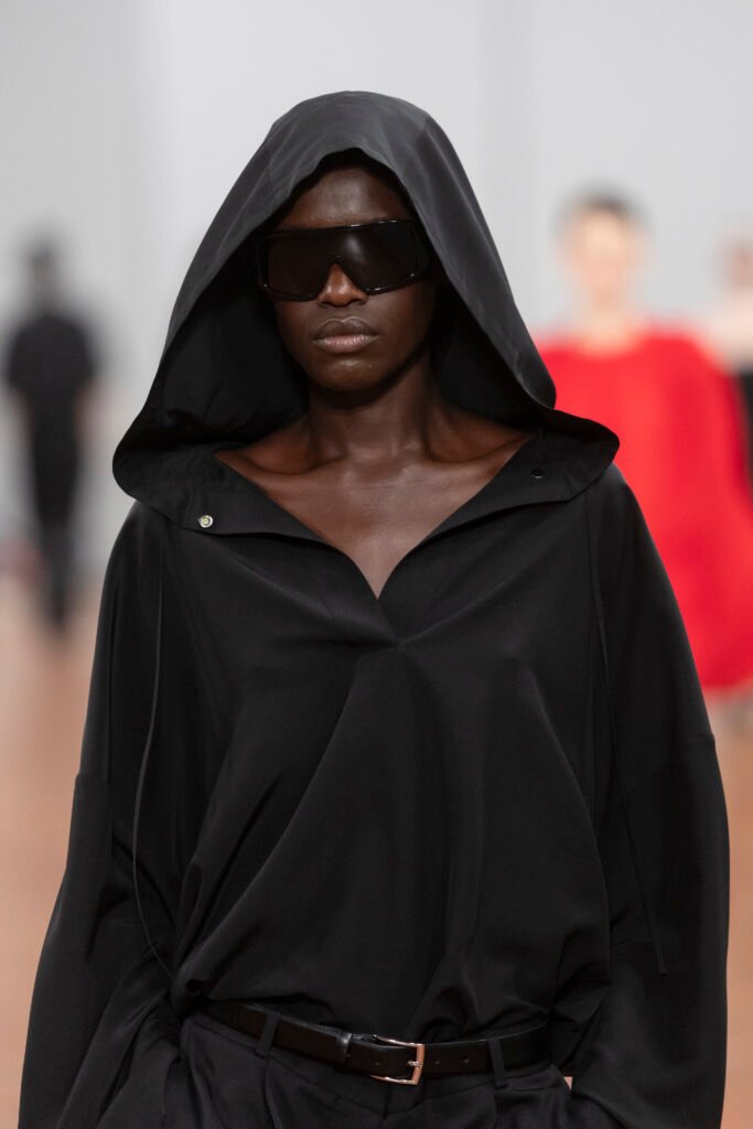 Tonos rojos en siluetas atrevidas e impregnadas de color crean un llamativo contraste sobre un fondo de neutros: azul acero, negro, blanco y arena. Combinando a la perfección la artesanía tradicional con los principios modernistas, la marca mantiene su compromiso con el diseño duradero y la calidad sin concesiones. Los materiales son más sostenibles, como los hilos de papel, los materiales reciclados y los hilos certificados por la Responsible Wool Standard.