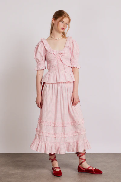 Si hay una marca que representa cottagecore, es Love Shack Fancy. Sus vestidos vaporosos con estampados florales y encajes son el centro de esta tendencia, con diseños en diferentes largos que reflejan un aire romántico.