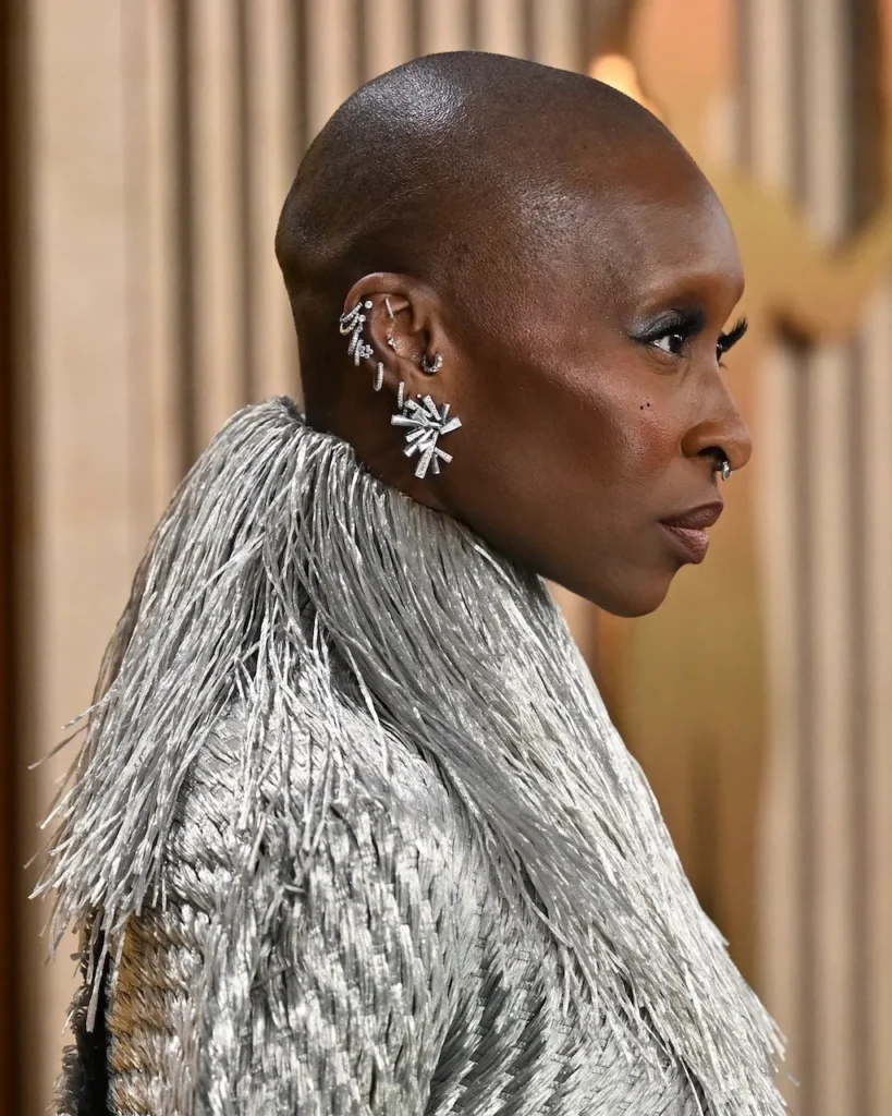 Durante la ceremonia, Cynthia Erivo, nominada a Mejor Actriz Principal, complementó su vestido con un maquillaje que incluía sombras plateadas y joyas de Bucherer, aportando más brillo al look. Además, en un guiño a su papel en la próxima adaptación de «Wicked», la actriz lució uñas verdes y anillos en tonos verdes y amarillos, simbolizando la Ciudad Esmeralda y el Camino de Ladrillos Amarillos.