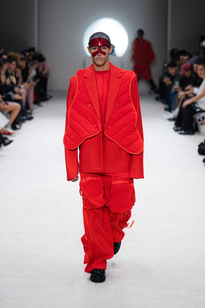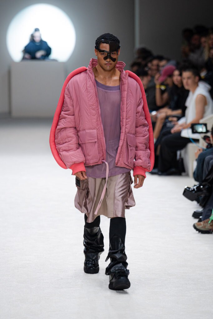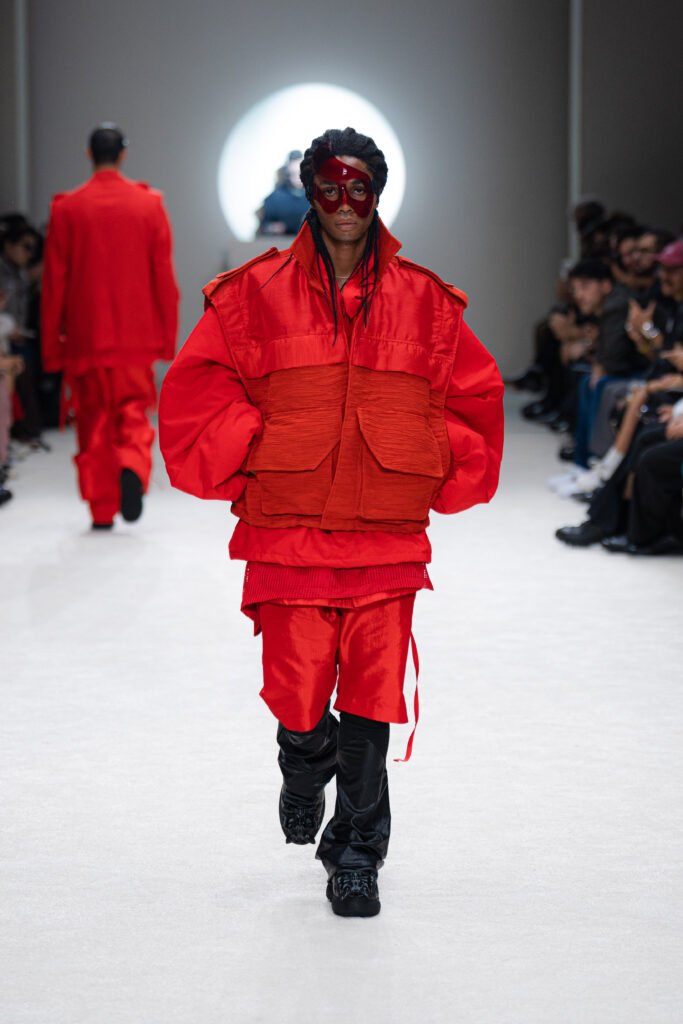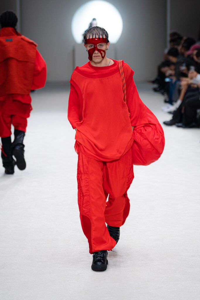 Manteniendo el ADN de la marca, los looks monocromáticos se despliegan en una paleta de colores que evoca el universo marino, con tonos como rojo vibrante, rosa empolvado, púrpura intenso, grises azulados y negro profundo. Cada pieza narra una historia a través de siluetas oversize más atrevidas y textiles que varían desde rompevientos deportivos hasta mezclas de lana cashmere y seda, pasando por algodones ligeros y poliéster con texturas acolchadas. Estas propuestas se materializan en formas voluminosas como maxi chaquetas tipo bomber, chalecos imponentes y accesorios vanguardistas.