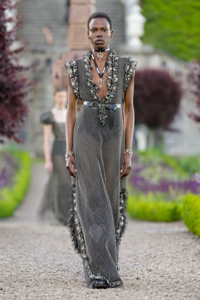 El venue de la pasarela fue Drummond Castle Gardens, ubicados cerca de Crieff, en Perthshire, los “Drummond Castle Gardens” son una joya oculta en el paisaje escocés, considerados entre los jardines más hermosos y mejor conservados de Europa. Estos jardines no solo son un lugar de belleza natural, sino también un testimonio de la rica historia y la elegancia paisajística. Fundados en el siglo XVII, los jardines de Drummond Castle fueron diseñados inicialmente con un estilo renacentista, reflejando la grandeza y la sofisticación de la época. En el siglo XIX, fueron rediseñados para incluir elementos victorianos, creando una armoniosa mezcla de estilos que se mantiene hasta hoy. Este rediseño fue llevado a cabo por la familia Drummond, que ha mantenido y cuidado estos jardines a lo largo de los siglos.