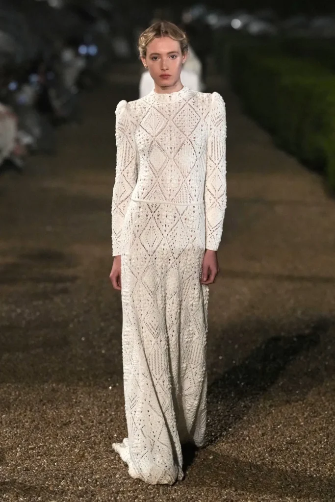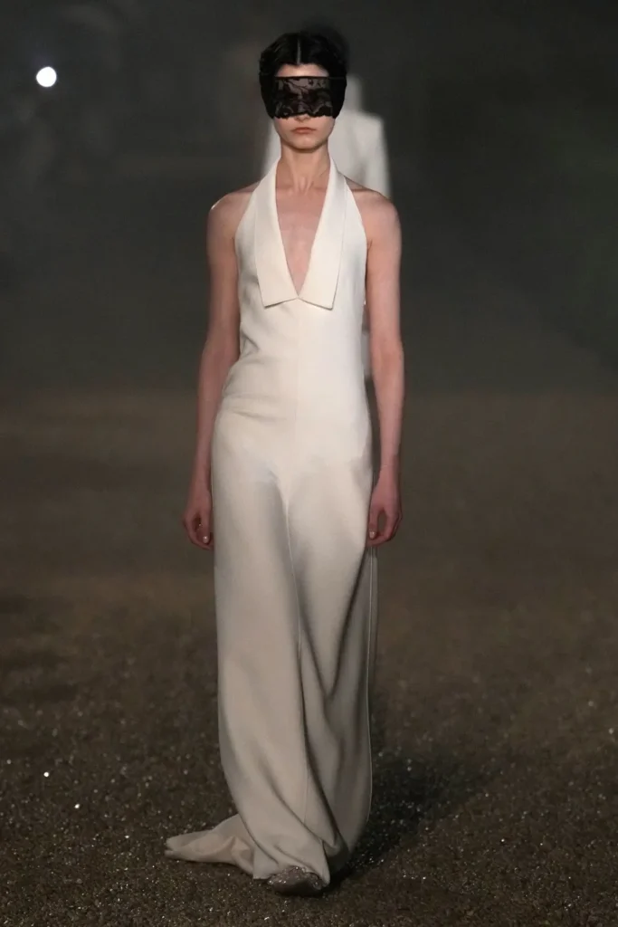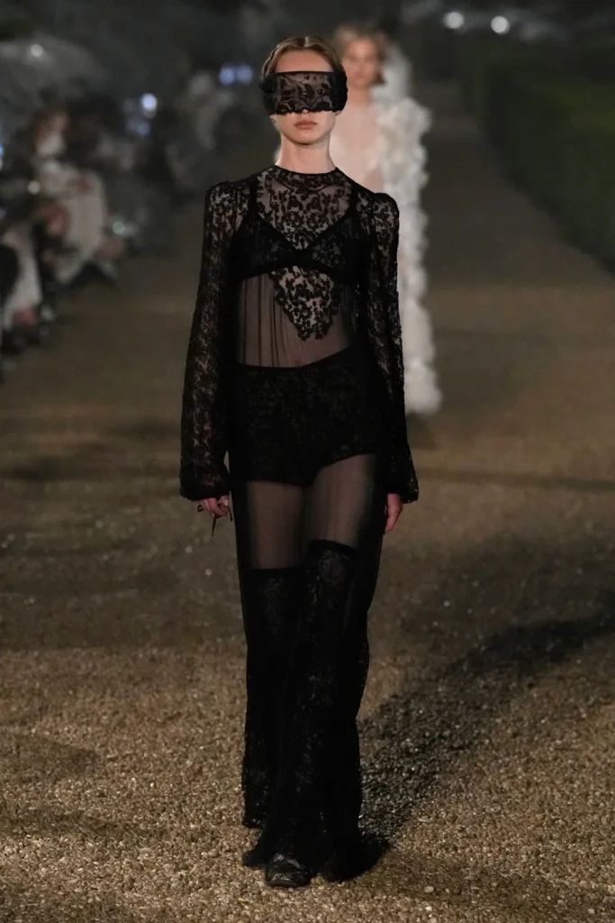 El desfile no fue solo una muestra de moda, sino una experiencia. Las modelos caminaron por senderos de grava bajo paraguas transparentes, mientras una ligera llovizna añadía un toque mágico al ambiente. La elección de Villa Albani Torlonia, con su rica colección de arte y su arquitectura neoclásica, reforzó la conexión entre la moda y el patrimonio cultural.