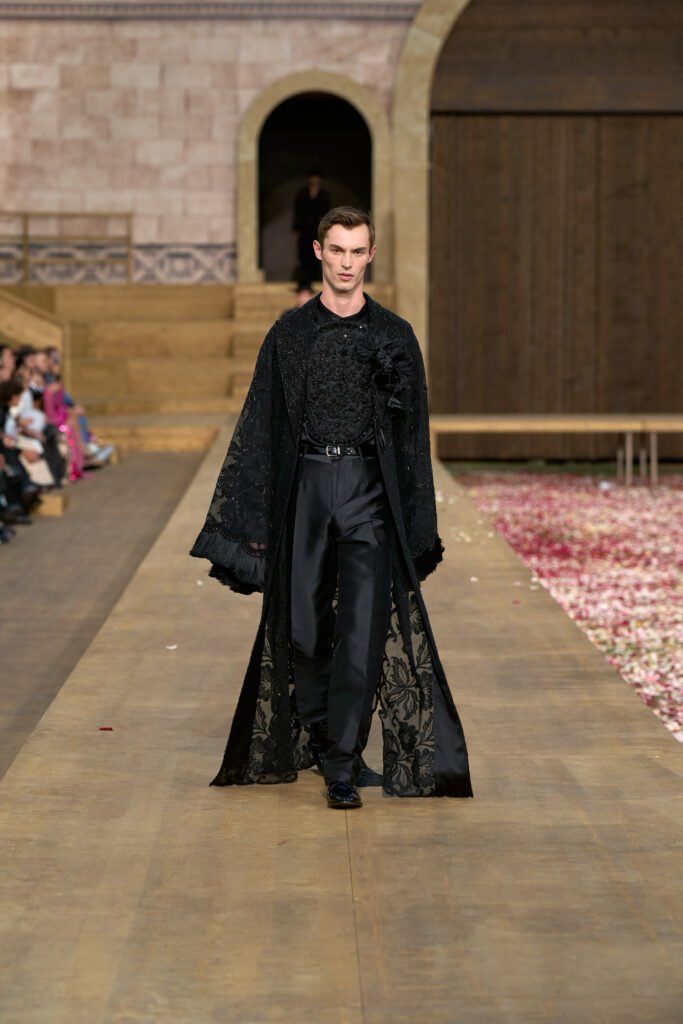 Históricamente, esta producción textil estaba reservada a las preciadas colchas que solo se encuentran en los ajuares más prestigiosos. Para evocar el estatus de élite original de esta técnica, las prendas Alta Sartoria están adornadas con cristales que resaltan los motivos decorativos y acentúan la singularidad de esta técnica de tejido.
