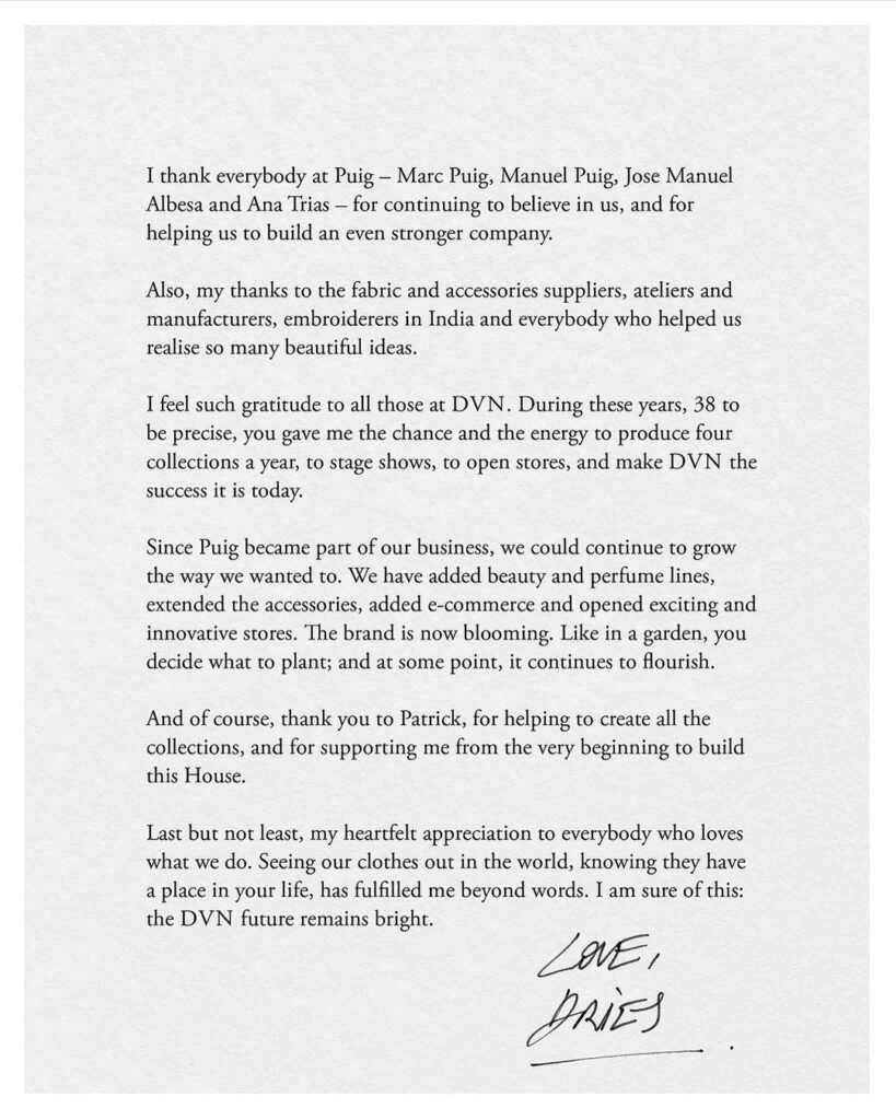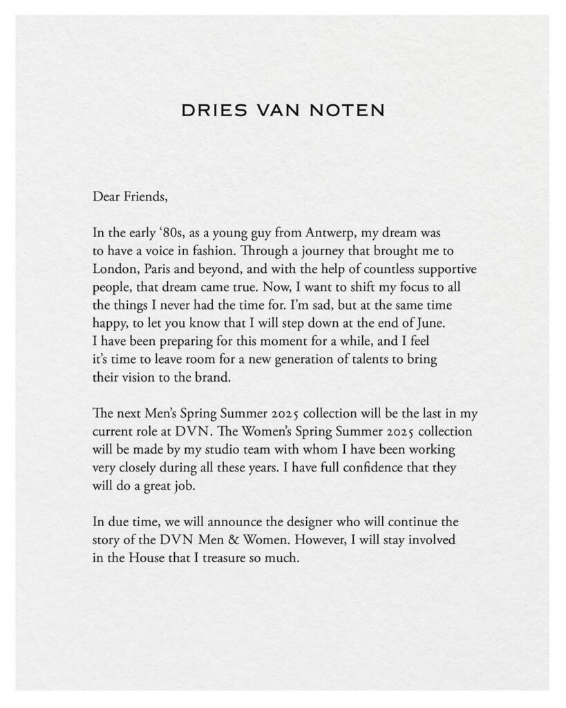 Después de más de 30 años, Van Noten dejará la dirección creativa de su propia marca. La colección primavera/verano 2025 de hombre será la última bajo su visión, programada para ver la luz en junio de este año, mientras que la colección para mujer será confeccionada por el equipo que conforma su estudio, en lo que llega el anuncio de su sucesor.