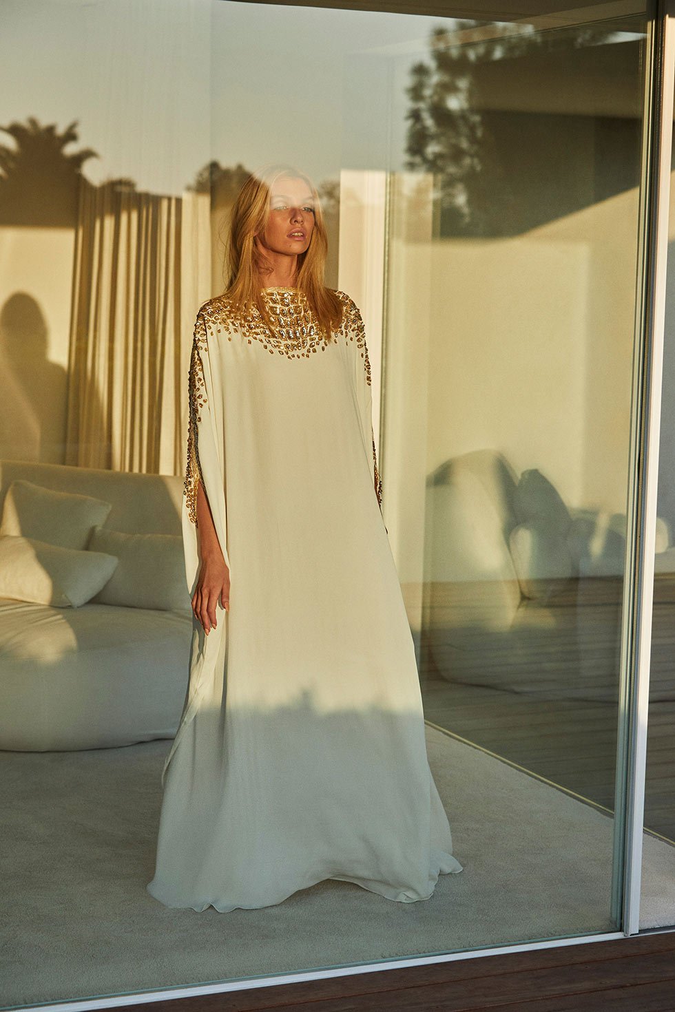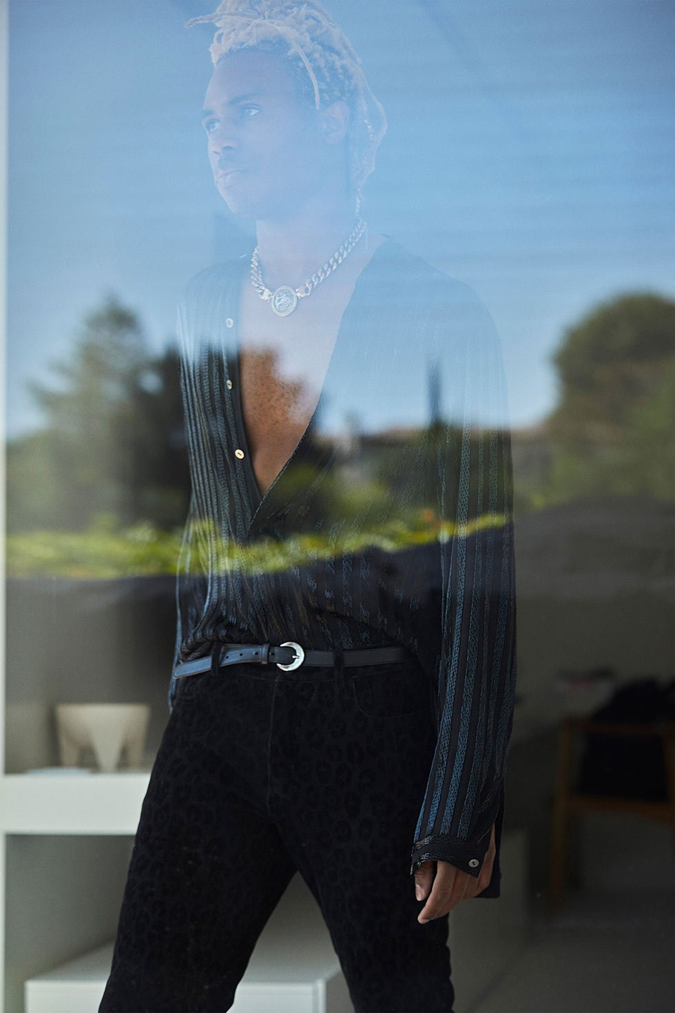 Inspirado en el mono transparente que le bordó a H.E.R. para los Oscar, los atuendos lo reciben en el escote de un caftán, además de que añadió espejos de meacrillato a los trajes.
