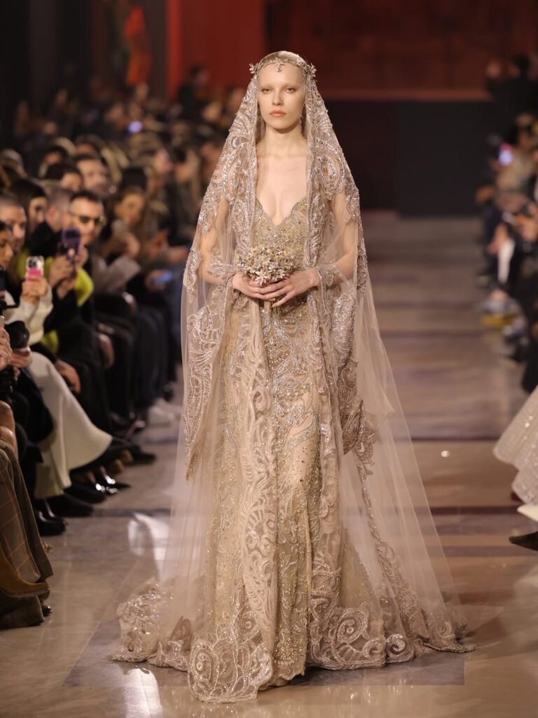 Cada pieza habla de feminidad poderosa: delicada en apariencia, pero imponente en presencia. La mujer de Elie Saab no se limita a vestir un vestido; lo habita, lo respira y lo transforma en una extensión de sí misma.