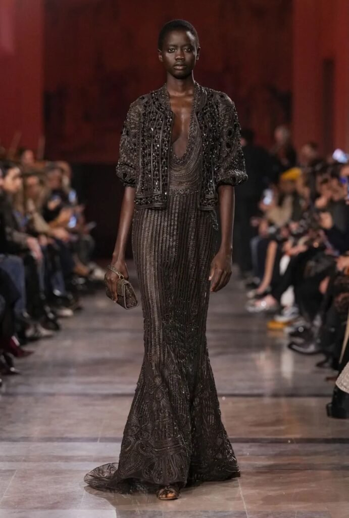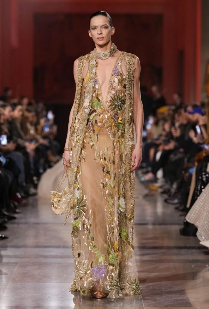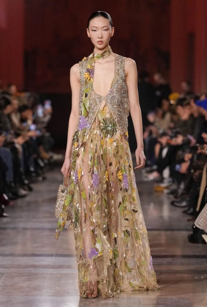 Cada prenda es una declaración de elegancia y libertad. Transparencias flotantes, bordados que capturan la luz y siluetas alargadas abrazan el cuerpo sin constreñirlo. Cristales, detalles tridimensionales y texturas que parecen moverse por sí solas crean una experiencia cinematográfica donde la Alta Costura se siente viva.