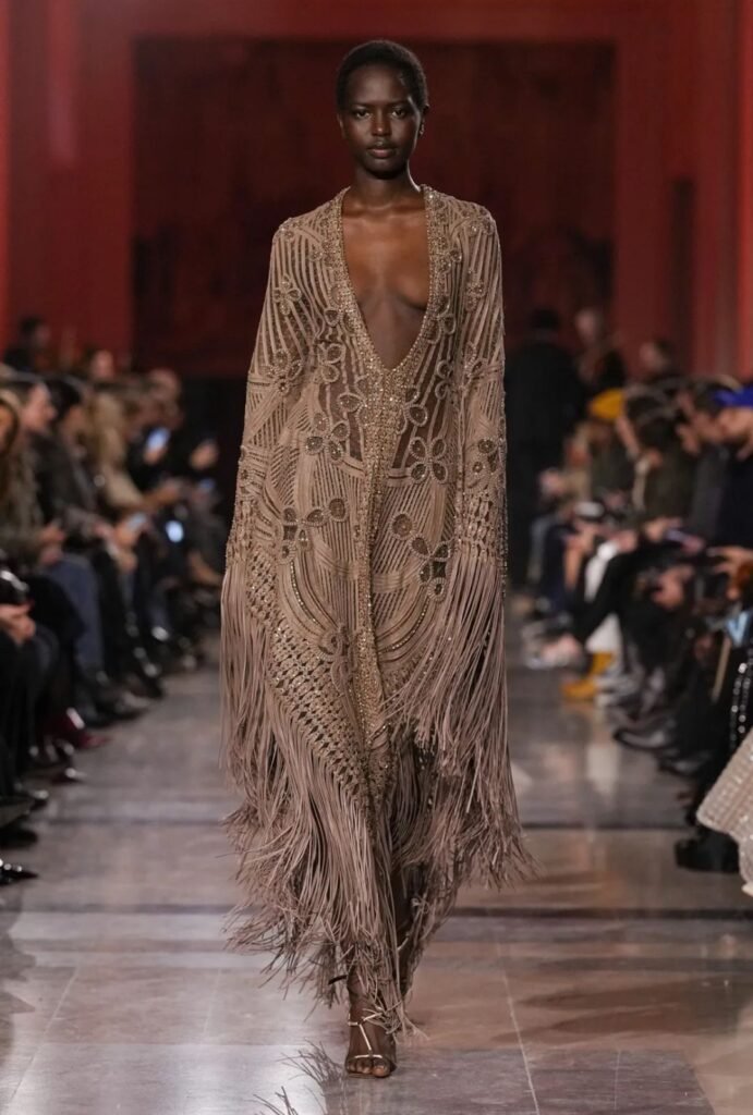 De Milos a Marrakech, Elie Saab revive el glamour de la jet-set con texturas tejidas, estampados abstractos y cristales que caen como cascadas sobre la piel. El cuero se convierte en joya, la malla metálica brilla como estrellas y cada sorpresa (una espalda descubierta, un giro inesperado del vestido) celebra la autoexpresión y el espíritu libre de la mujer moderna.