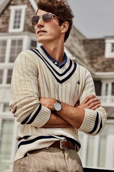 Algunas prendas asociadas con el estilo preppy incluyen polos, suéteres con cuello en V, faldas plisadas, pantalones chinos, blazers, mocasines y zapatos tipo náuticos.