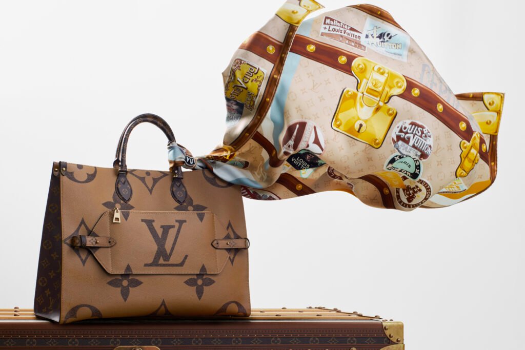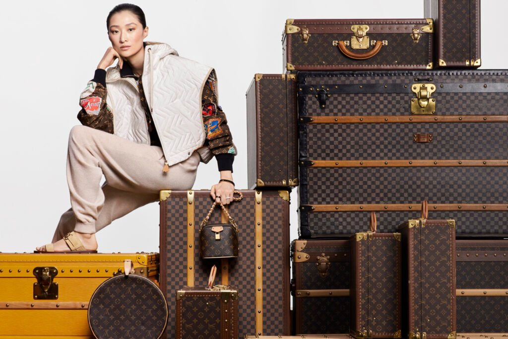 Los escenarios construidos a partir de multitud de baúles recuerdan viajes pasados y el papel de Louis Vuitton en aventuras incontables. Esta emoción se traslada al Flight Mode, que conecta pasado y presente. Los sellos del hotel Élysée Palace aparecen directamente sobre la lona Monogram en bolsos como el Keepall y el Side Trunk, junto con pequeños porta pasaportes y maletines de viaje. Esta nueva lona reproduce el tejido original de los baúles de finales del siglo XIX: una mezcla de algodón y lino, con un ligero revestimiento de resina.