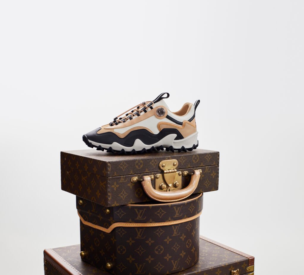 Dado que el Modo Vuelo engloba actividad y relajación a partes iguales, el calzado abarca desde la dinámica zapatilla LV Rush, con su reconocible suela gráfica y detalles inspirados en el trail en la parte superior, hasta los mules y sandalias adornados con el característico gancho Louis Vuitton. La animación del Palacio del Elíseo se imprime sobre nailon en la icónica comodidad Pool Pillow o se reproduce en forma de parches elaborados en piel en la zapatilla abierta Lous.