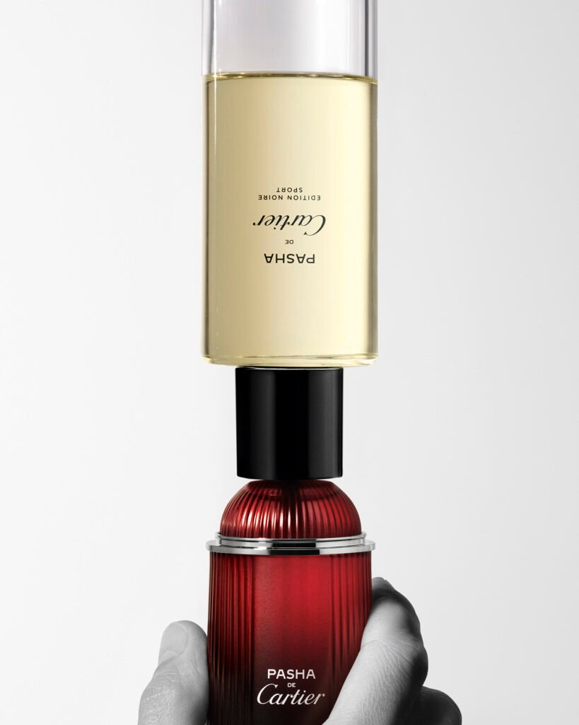 El frasco, fiel a la herencia de la colección Pasha de Cartier, mantiene su silueta icónica inspirada en la corona de los relojes Cartier, reinterpretada en un diseño sofisticado con detalles en rojo que reflejan poder, modernidad y deportividad.