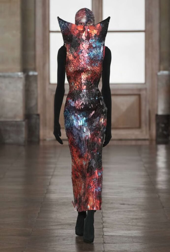 Superficies metálicas fundidas, drapeados fluidos y estructuras orgánicas convivieron en perfecta tensión. La colección exploró un territorio donde la espiritualidad dialoga con la innovación, y donde la tecnología no sustituye a la mano humana, sino que la potencia.