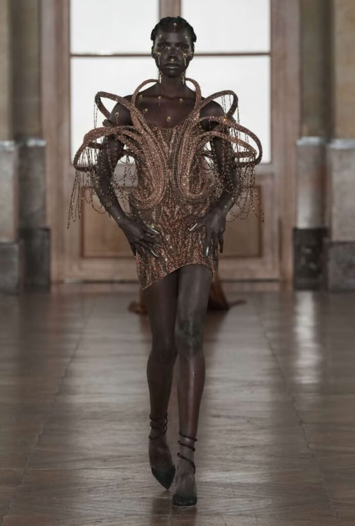 Desde el primer look (una escultura corporal resplandeciente que fusionaba blanco y negro) quedó claro que el cuerpo era el lienzo, no el límite. Cada silueta parecía tallada, no cosida. Los volúmenes se expandían y contraían como si respiraran, equilibrando peso e ingravidez, fuerza y fragilidad.