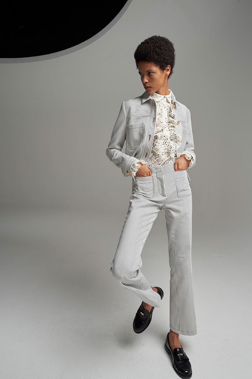 “Incluso las camisas o los pantalones que propongo en la colección están impregnados del aspecto cultural de mi práctica de atelier de couture”, compartió.