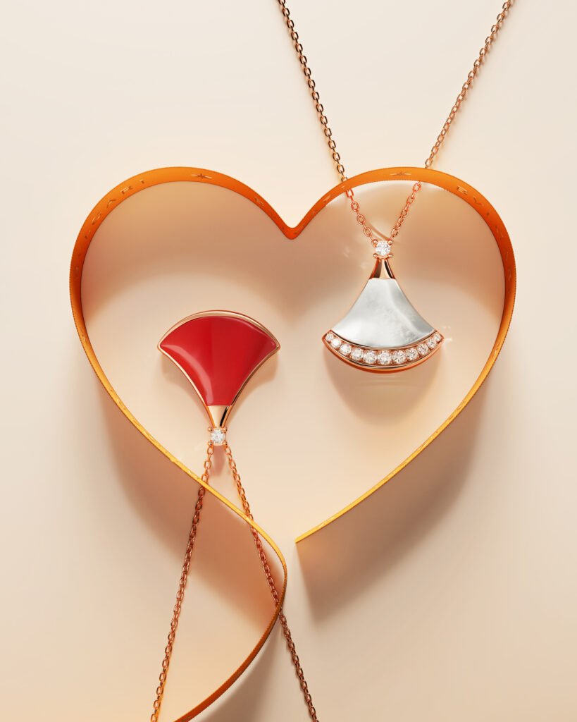 En cuanto a la joyería, los refinados collares Divas’ Dream de oro rosa celebran el amor con sus icónicos colgantes, artísticamente engastados con inserciones de cornalina y madreperla.