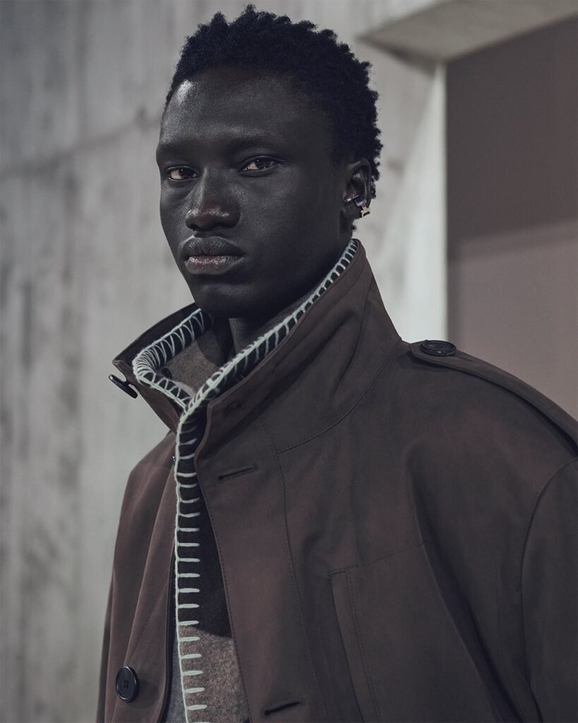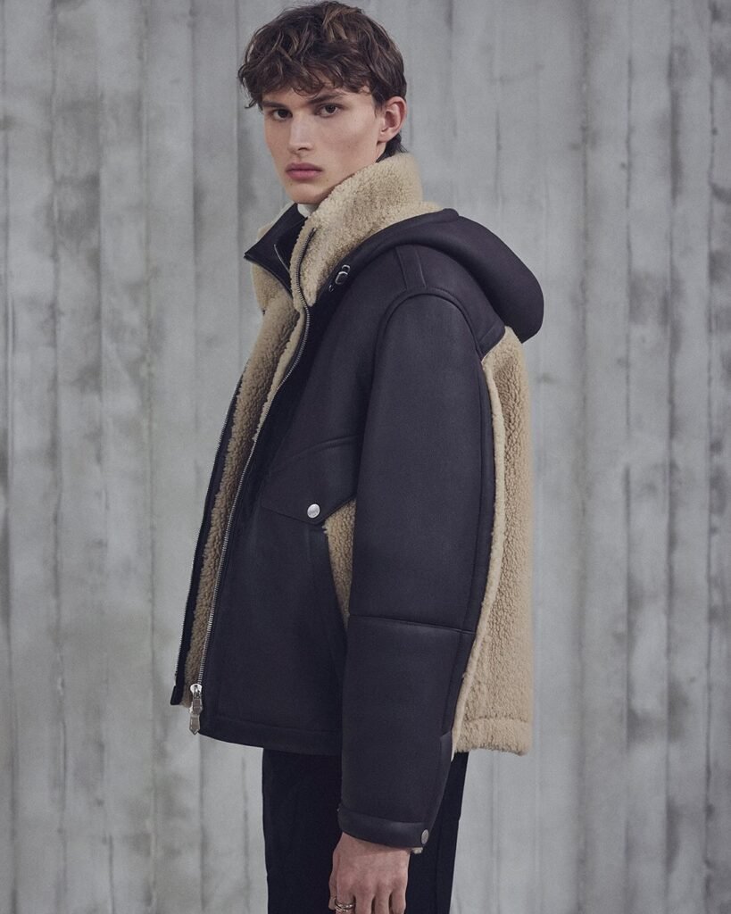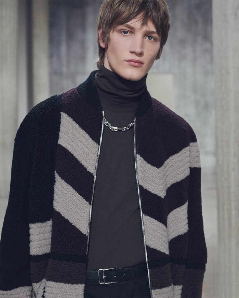Un vestuario seguro y envolvente. Entre capuchas y pasamontañas, parkas con acabado de manta, nuestros corazones se mecen suavemente. Una chaqueta de doble botonadura se eleva, un cuello se endereza, la técnica captura el momento, fijándolo sin congelarlo. Revestimientos de estribos de cuero, botones oblongos de cuerno, pespuntes de guante, camisas de doble raya: el detalle purifica la silueta, el estampado cuadriculado de las prendas de punto evoca una marquetería flexible.