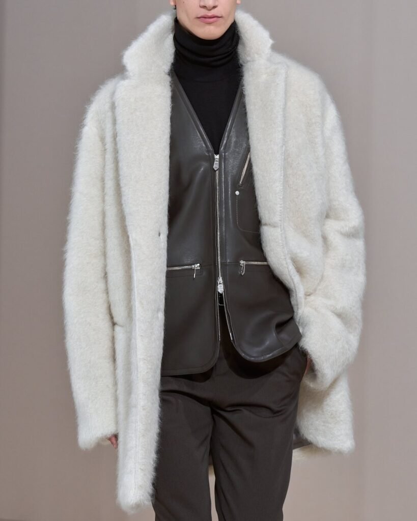 Dinámica, la línea se redondea sin perder su forma. Urbana y gráfica, se alarga con abrigos cortos o largos, llevados sobre pantalones estrechos o anchos. El look moldea la silueta a través de una visión clara y arquitectónica, dando a cada prenda una presencia autónoma.