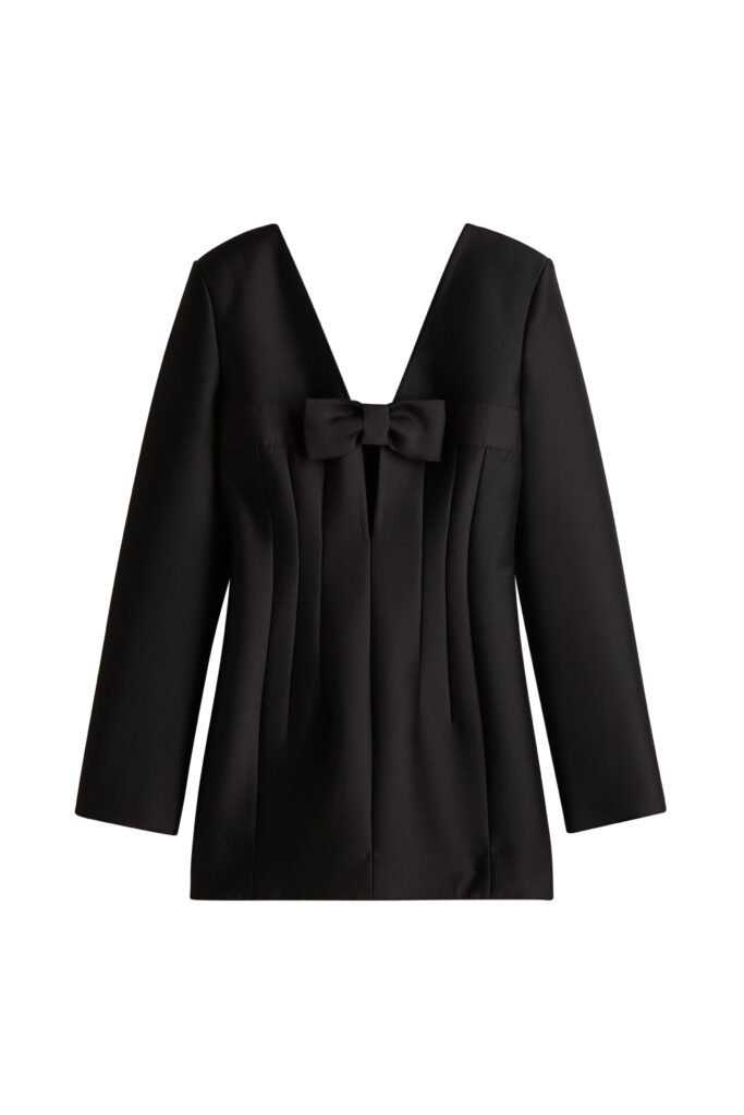 El estilo es elegante y monocromático, utilizando volúmenes y proporciones inesperadas para crear estilos distintivos para cualquier guardarropa y celebración. Las siluetas minimalistas y sofisticadas de la colección se equilibran con un enfoque lúdico en los adornos. Los looks en blanco y negro se acentúan con lentejuelas, lazos y bordados decorativos. Una clásica camisa de esmoquin se embellece en los puños con cristales, mientras que un traje de pantalones cortos de esmoquin está bordado con cuencas.