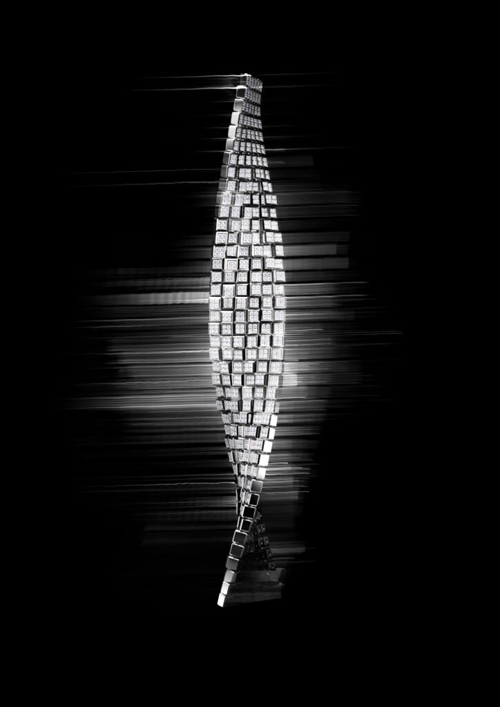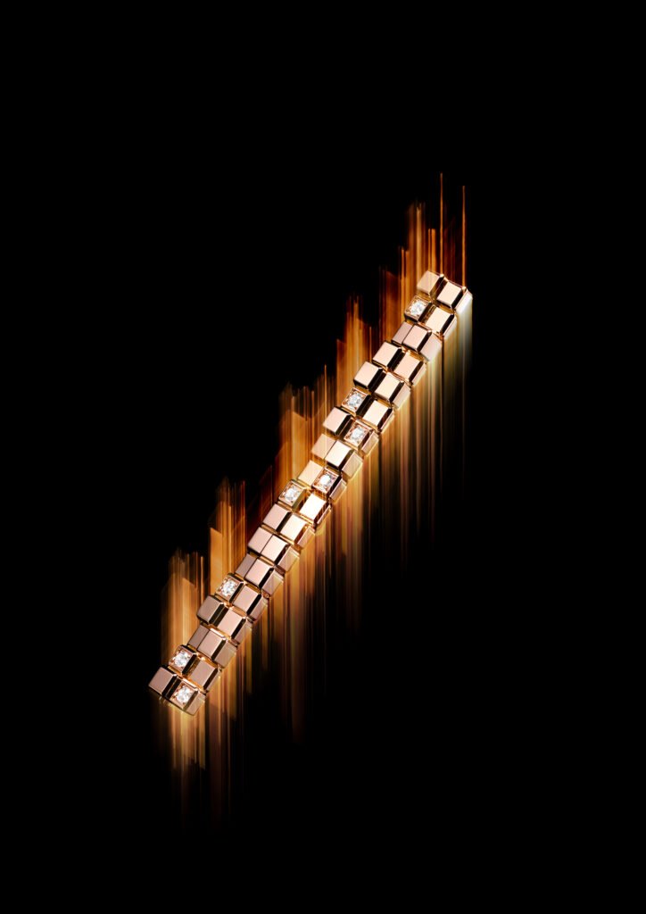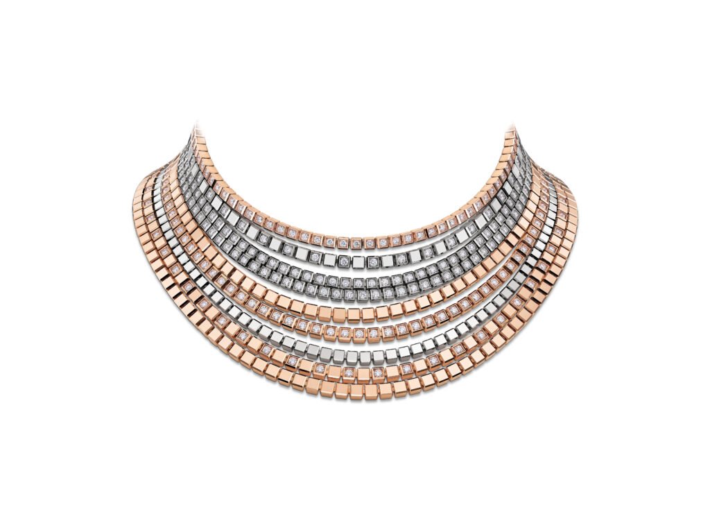 En el corazón de la colección se encuentra un collar transformable, único en su género, formado por unas hileras de cubos articulados de oro blanco y rosa ético. Un total de nueve hileras crean una silueta dinámica, se añaden o se retiran por grupos de tres según la ocasión. Este diseño modular se hace eco del espíritu de acumulación y de mix & match que caracteriza desde sus inicios los anillos y las pulseras Ice Cube, pero con una fluidez, una amplitud y una presencia renovadas.