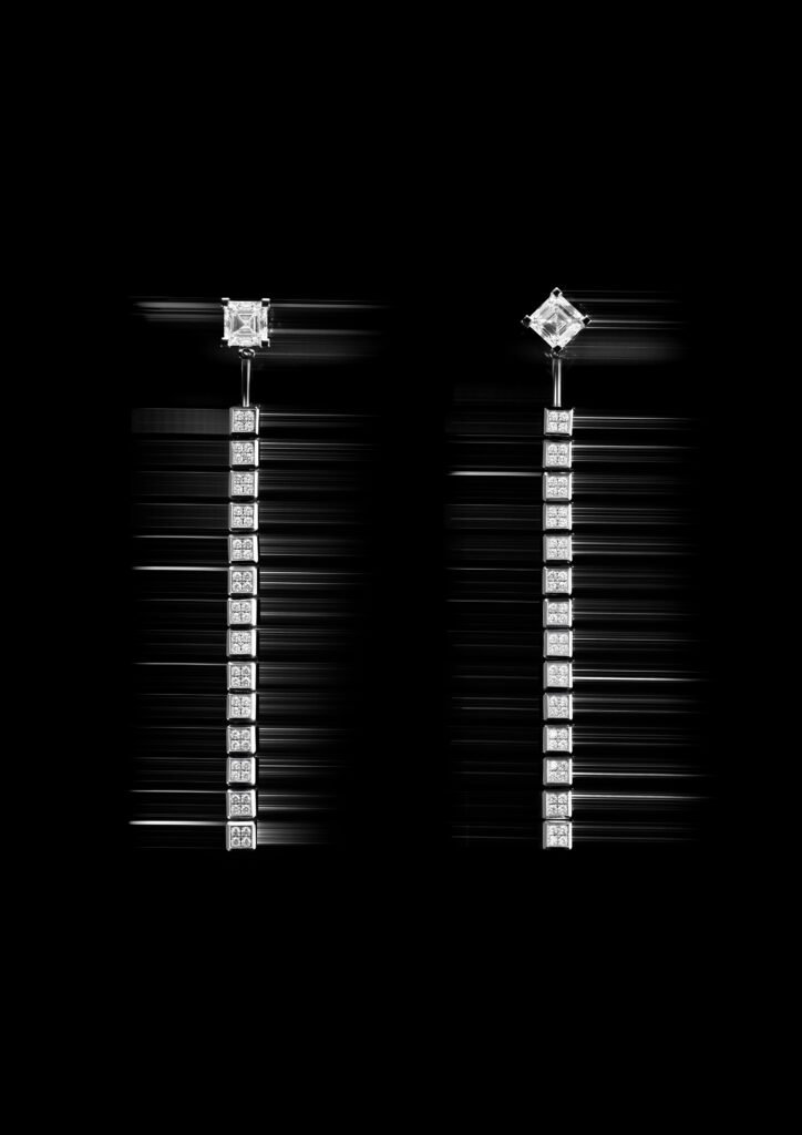 Siguiendo la misma arquitectura, un par de pendientes está formado por dos solitarios talla Asscher de 1,2 quilates, cada uno de ellos sujeto al otro lado de la oreja por una hilera fluida formada por 14 cubos engastados con diamantes. Este colgante se puede retirar en uno de los pendientes, o incluso de los dos. Esto permite llevarlos con un estilo asimétrico o más minimalista.