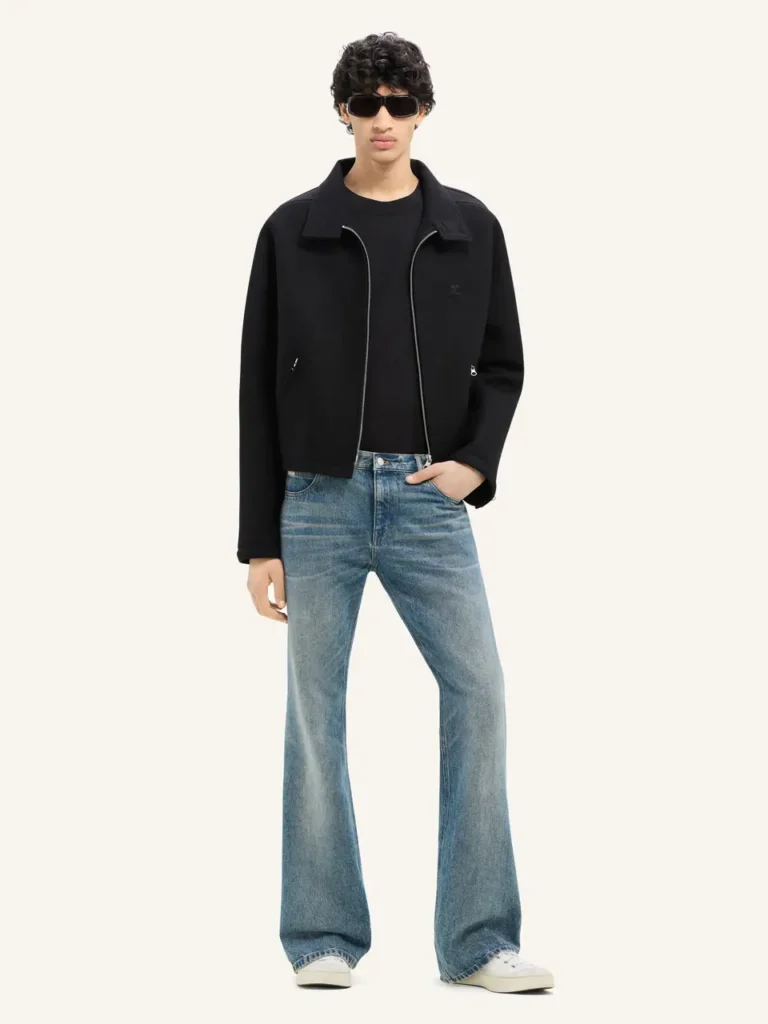 Si algo define esta versión de los flare jeans es el juego de proporciones. Las cinturas altas y bien marcadas continúan dominando, creando un efecto visual alargado y estilizado. Firmas como Saint Laurent y Courrèges han apostado por patrones ultra estructurados que se abren en campanas dramáticas, evocando un aire futurista.