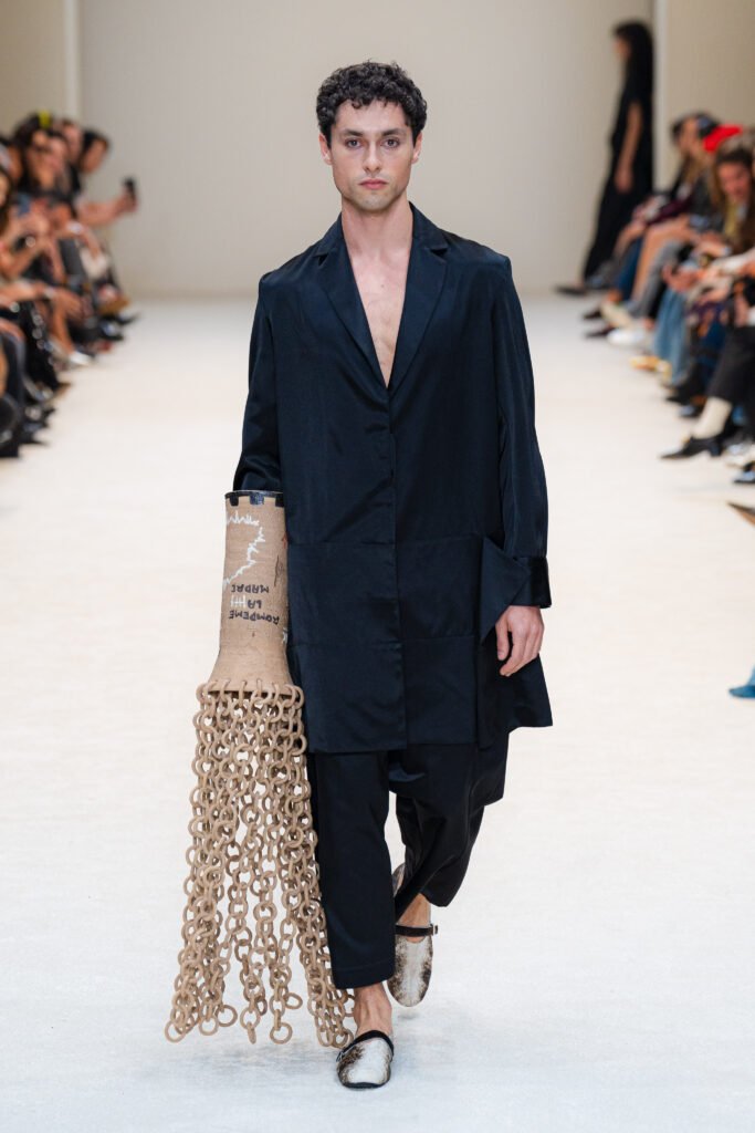 El calzado en dorma de pez. «El pescadito» flats en forma de sueco con correa en piel de pescado piel de becerro y suela de llanta reciclada de Baku Artesanal (Oaxaca,México) curtido a base de plantas y vegetales propias de la región utilizando técnicas tradicionales, en tonos naturales y variantes teñidas con tintes naturales como la grana cochinilla, añil, palo de mora. El estilismo para esta pasarela lo llevó a cabo Gustavo García-Villa.