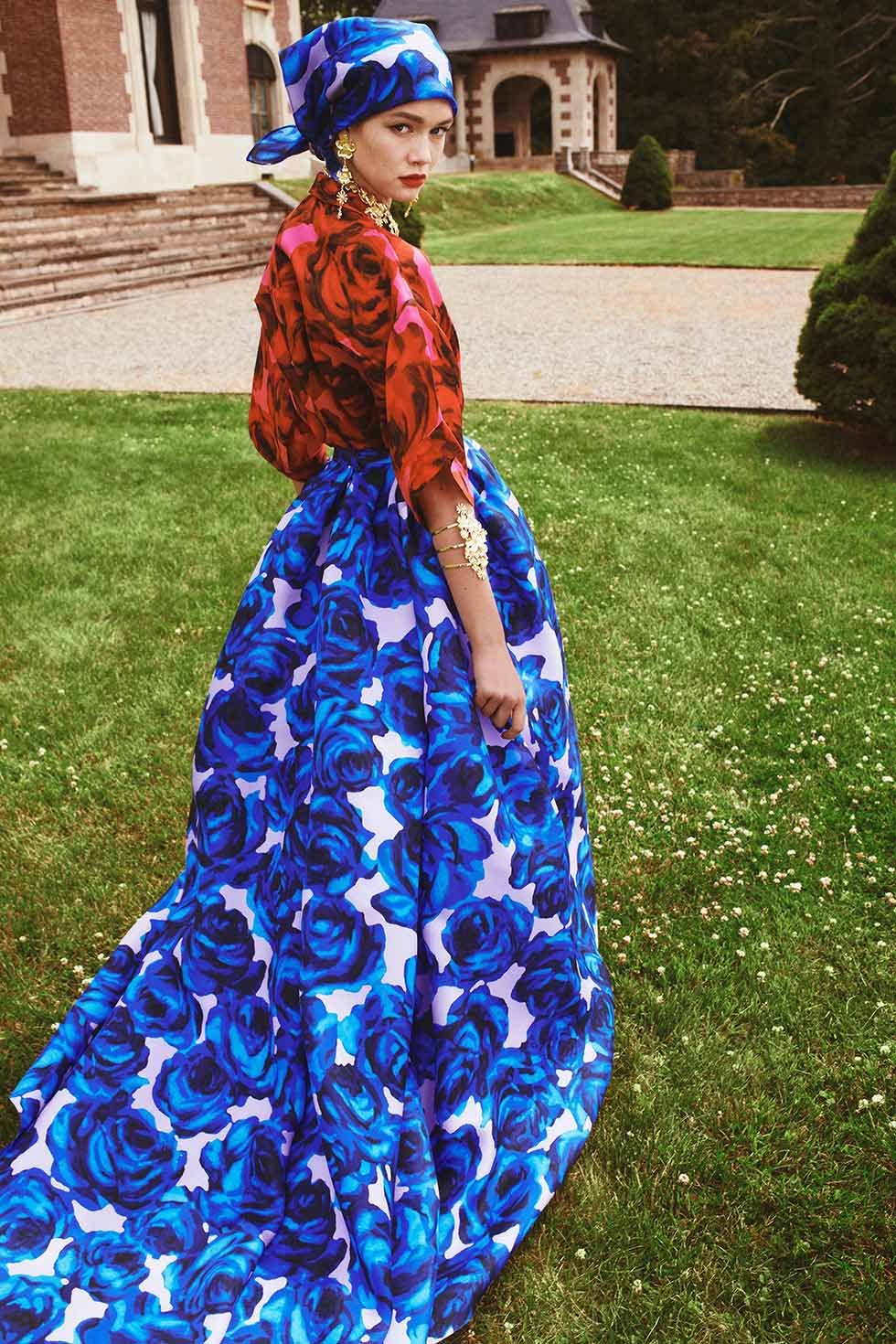 También encontramos una combinación de blusa y falda de bola en dos estampados de rosas diferentes, uno rosa y rojo, el otro azul eléctrico.