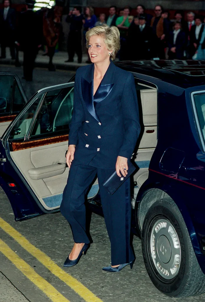 Con su divorcio y empoderamiento personal, La Princesa Diana apostó por trajes sastre. Blazers masculinos, pantalones rectos y estructuras marcadas se convirtieron en parte de su uniforme post‑royal. Le enseñó al mundo que una mujer puede lucir autoridad sin renunciar al glamour, combinando chamarras oversize con stilettos o sneakers .