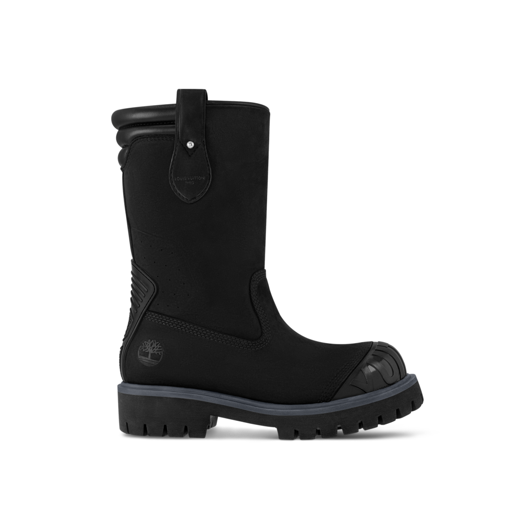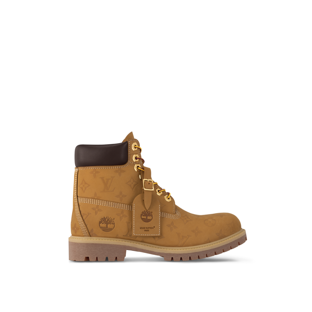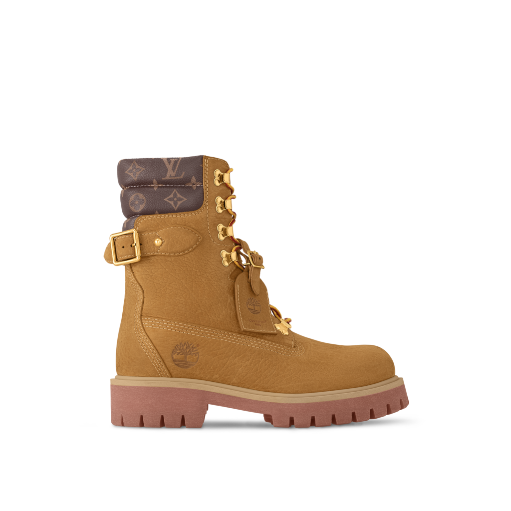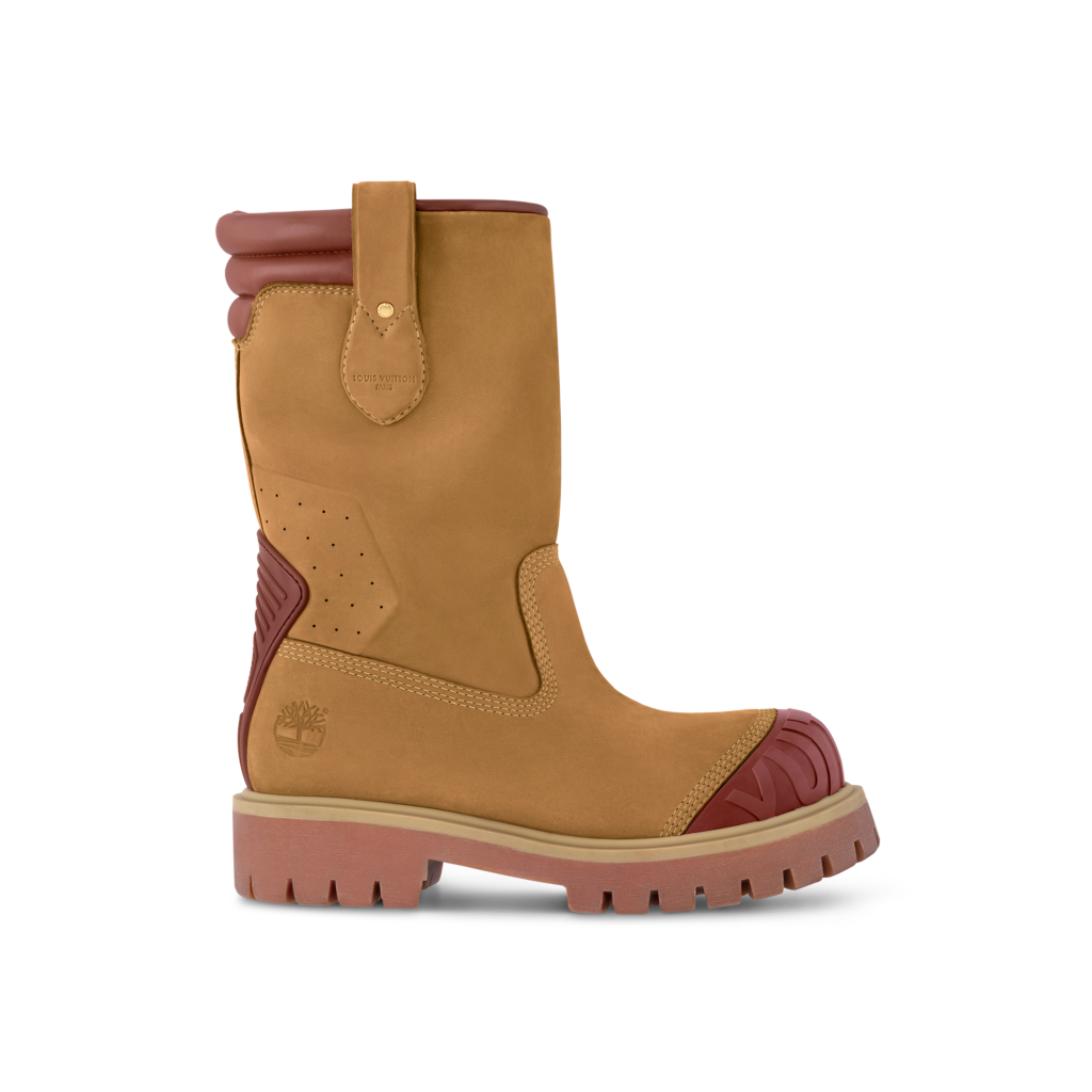 La segunda línea de la colaboración entre Louis Vuitton y Timberland, la LV Boot, magnifica la silueta de 6 pulgadas en un quince por ciento para una versión direccional del clásico y se manifiesta en cinco formas diferentes, cada una con la suela exterior de goma con tacos. Un botín toma forma en cuero granulado de color trigo o negro con un forro de lengüeta con Monogram en relieve y adornos de etiqueta de cuero. Una bota ranger con una caña alargada, ganchos para cordones y detalles de correa se materializa en cuero granulado de color trigo o cuero de becerro granulado negro. Una bota de media caña sin cordones con detalles de tirador de bolso y puños de tobillo de cuero marrón está elaborada en cuero nobuck de color trigo o negro. Finalmente, una bota con arnés sin cordones con hebillas laterales, así como un arnés, se propone en cuero nobuck de color trigo o negro.