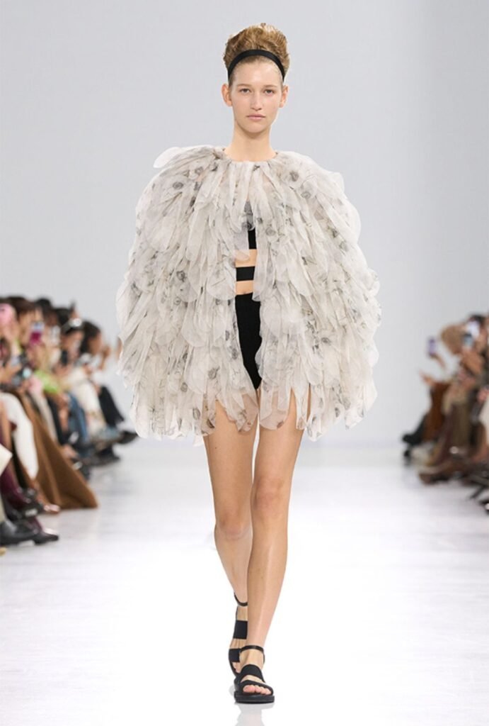 El desfile se mueve en un territorio donde la imaginación no traiciona la funcionalidad. Una gabardina impecable puede coronarse con pliegues que se despliegan como hojas o plumajes, mientras que una falda lápiz se transforma gracias a crestas etéreas que evocan animales marinos.