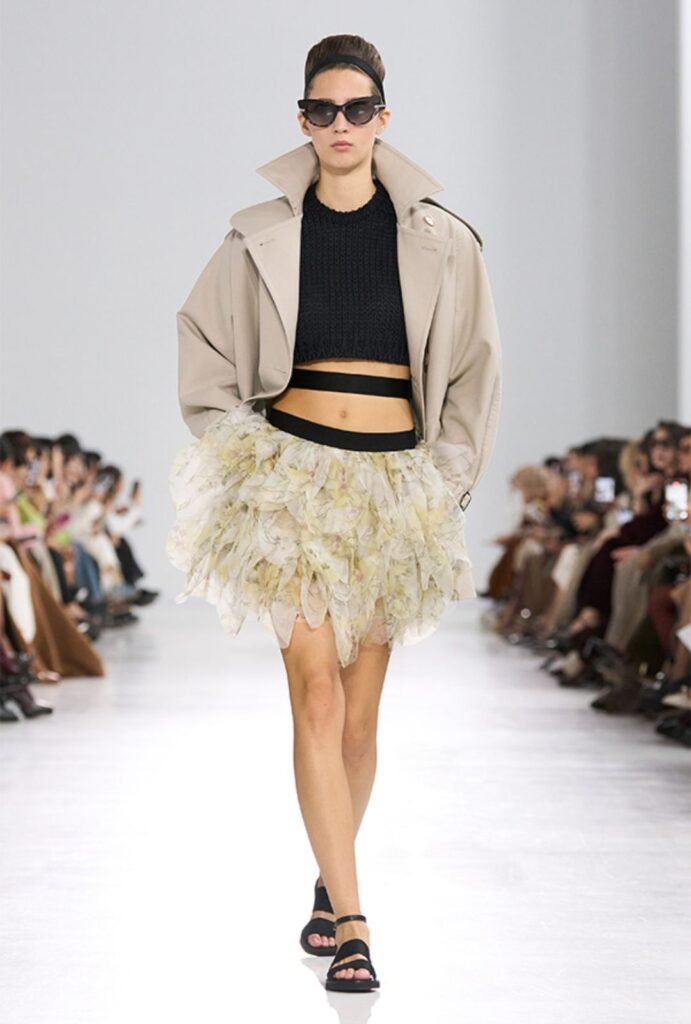 La colección SS26 de Max Mara apuesta por piezas que combinan rigor y fantasía. La falda lápiz se reinventa con detalles voluminosos que redefinen su contorno, mientras que la organza aparece transformada en faldas compuestas por cientos de piezas plegadas que recuerdan flores exóticas.