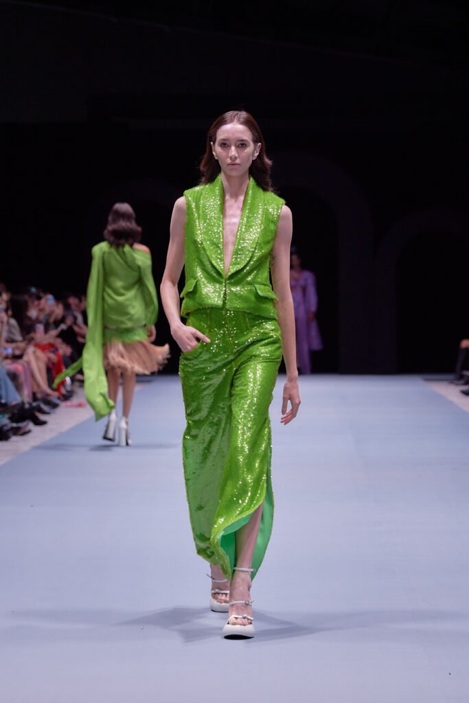 Cuando uno de los looks más sobrios es un vestido negro midi con plumas verde neón recorriendo todo el escote, es evidente que la colección es una explosión estética. Hay un choque de texturas entre piezas de charol, vestidos de encaje dorado, abrigos de efecto pelo y lentejuelas.