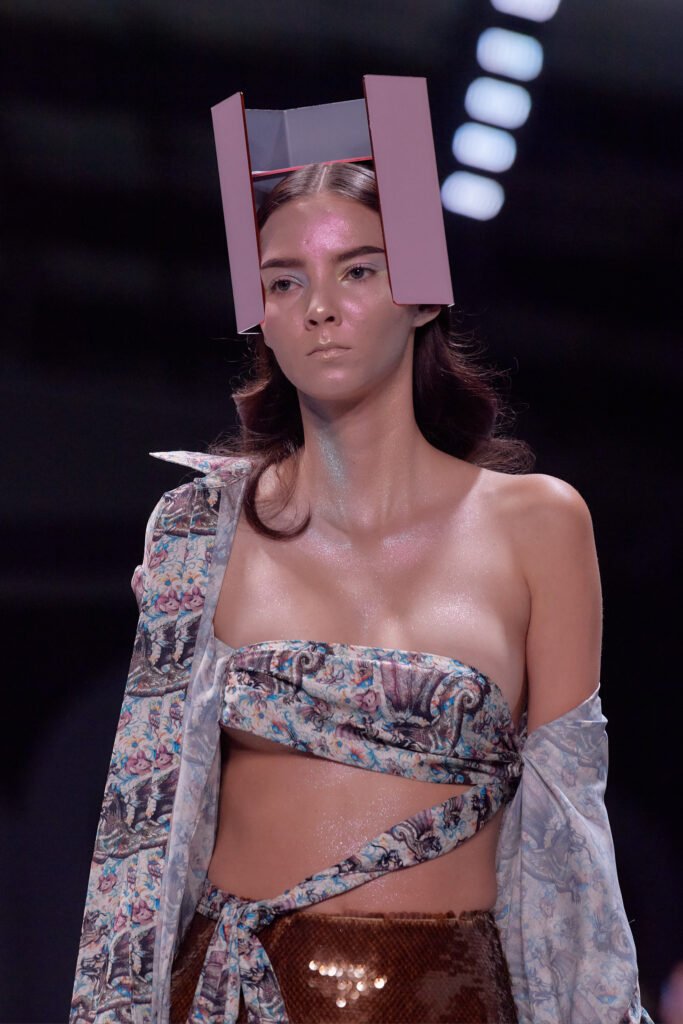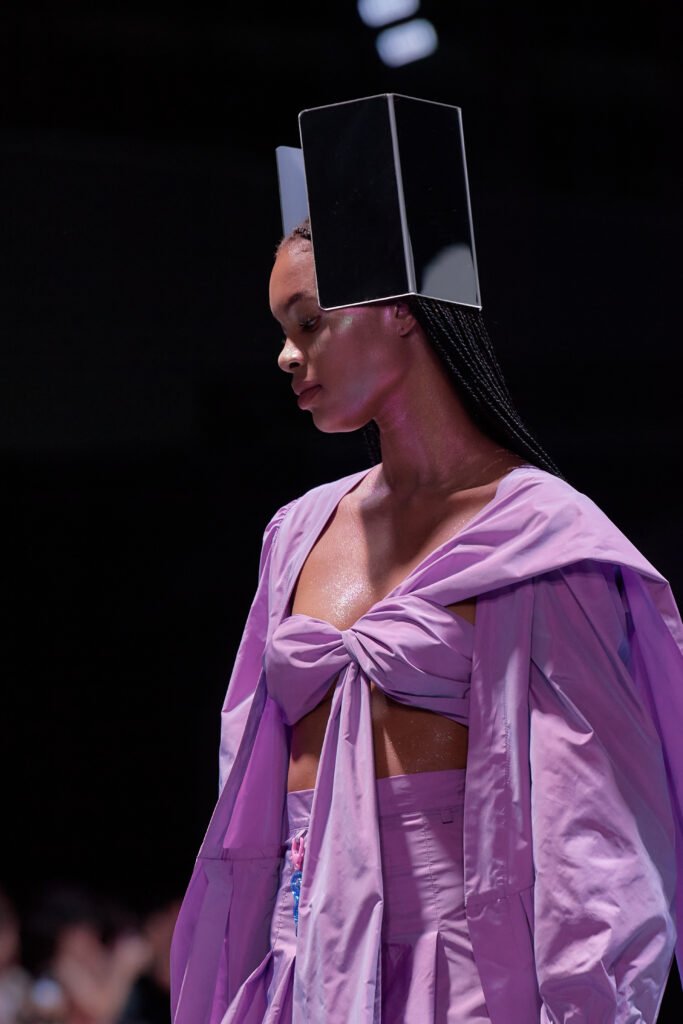 Esta extrañeza que presenta se extiende más allá de las prendas. Tocados de espejo que reflejan a la audiencia, rostros y pieles completamente metalizadas y zapatos que van desde plataformas con estampado de tablero de ajedrez hasta oxfords grises complementan la colección.