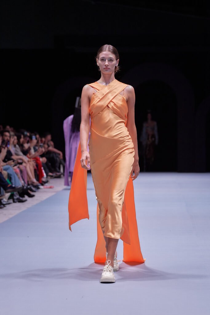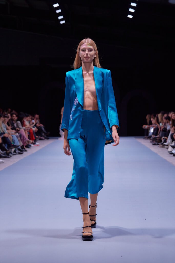 Alexia Ulibarri introduce la contradicción entre la feminidad y la masculinidad en diferentes versiones del traje sastre. En dos y tres piezas, los subvierte a través de satines coloridos.