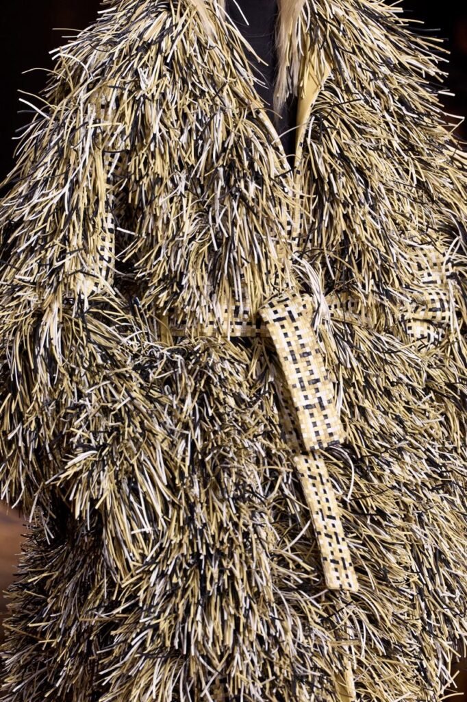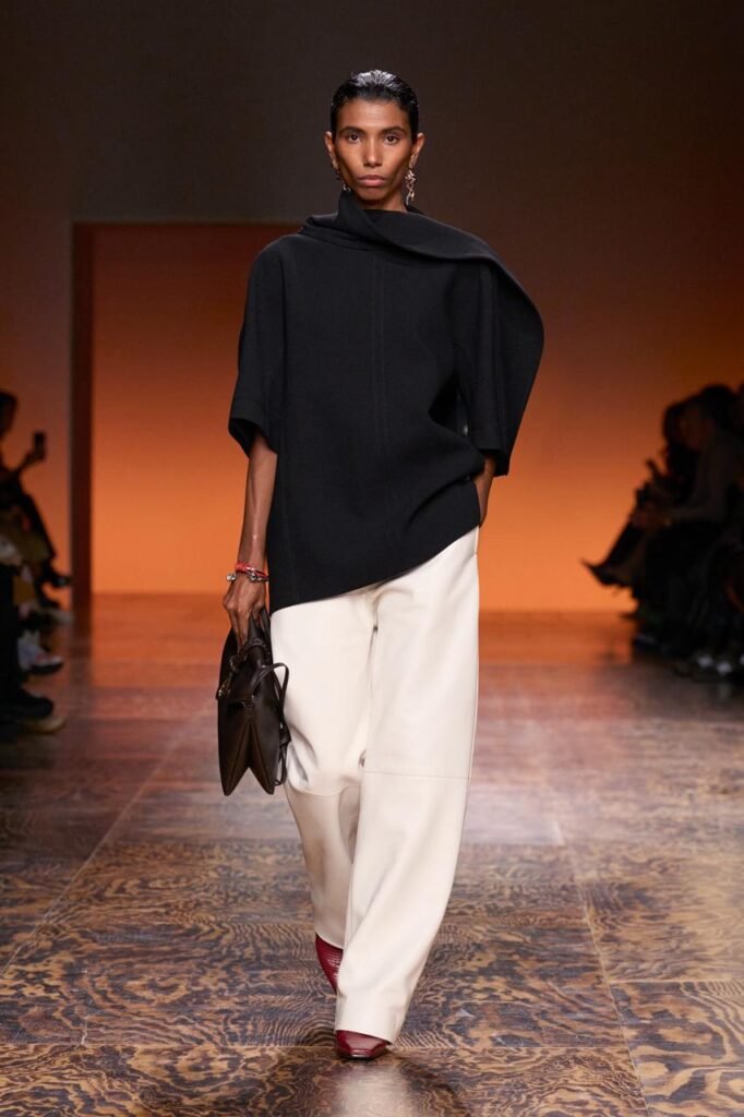 Desde el look más sencillo, el primero con pantalones de bota ancha y flequillos, un abrigo capullo negro de alta costura cuya silueta redondeada y tridimensional era el resultado del plegado de sus costados y mangas, que estaban asegurados con grandes botones de latón. Y así estilos entre cueros y tejidos, se dio a notar la dualidad del diseño (una tendencia que venimos viendo)  con faldas bicolor arruchadas del lado como broche.