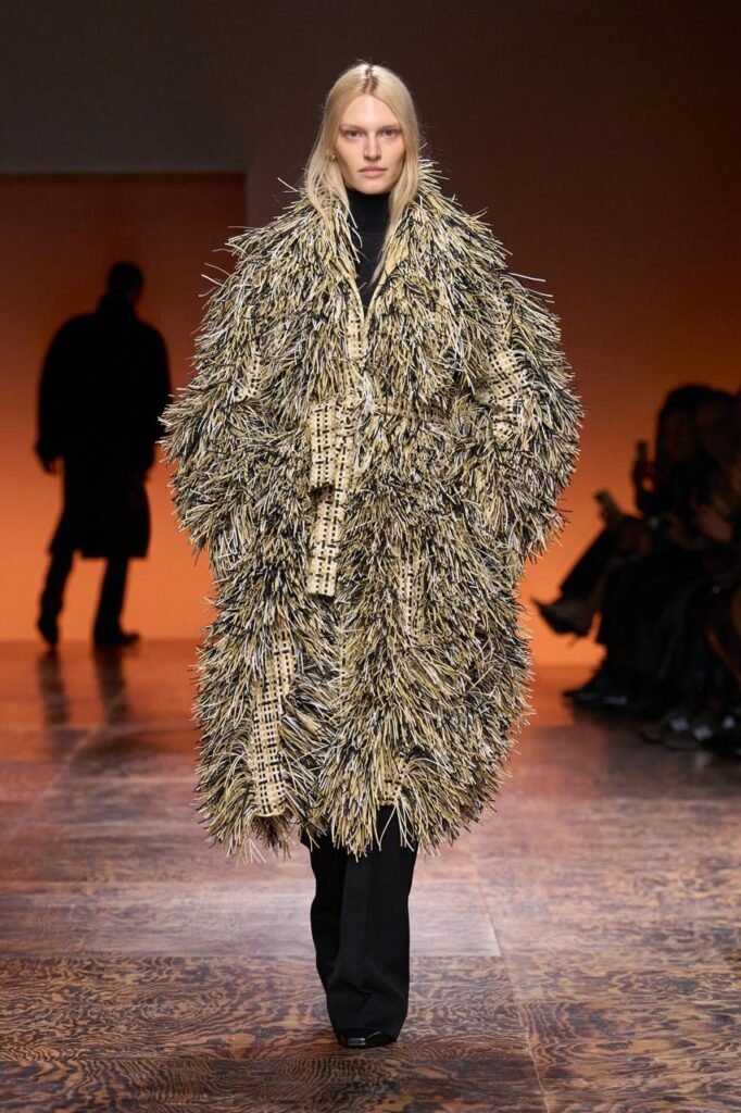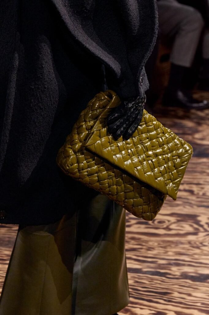 Bottega, una marca siempre lujosa con un foco artesanal y una sutiles de diseño fue todo menos minimalista.  El carácter monumental y arquitectónico de las prendas, sumado a la consistencia y estabilidad de los tejidos hacen que la idiosincrasia del diseño se vuelva protagonista en el espacio que se encuentra pues su opulencia al moverse es distintiva.