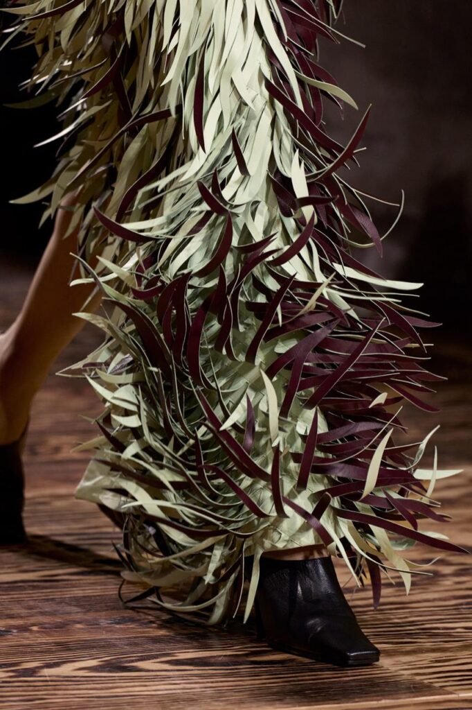 Entre figuras de cactus hechas en manos, Matthieu Blazy, director creativo de la marca presentó una colección monumental. Si bien recomendamos que visites a las marcas y veas el video de la pasarela para Bottega te lo imploramos. Es una colección donde el movimiento del textil es imperativo para entender la brillantez del diseño y la confesión.