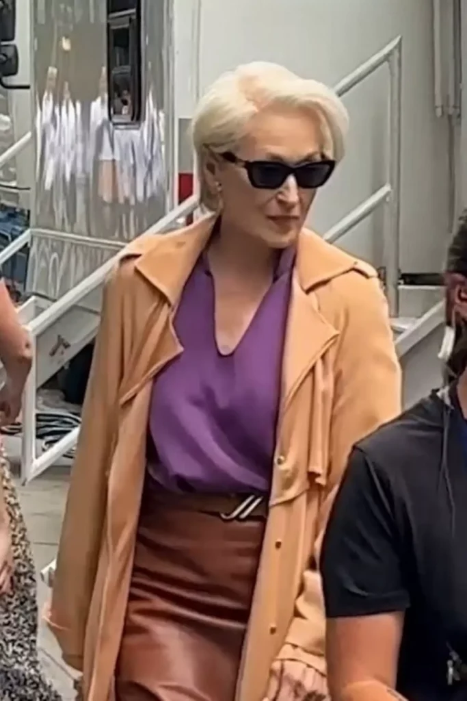 En cada foto del set, Miranda Priestly parece llevar armadura. No hay nada improvisado en su estilismo: cada botón, cada silueta estructurada, parece pensada para imponer poder. En una época donde los límites de la moda están más abiertos que nunca, ella se mantiene fiel a su actitud.