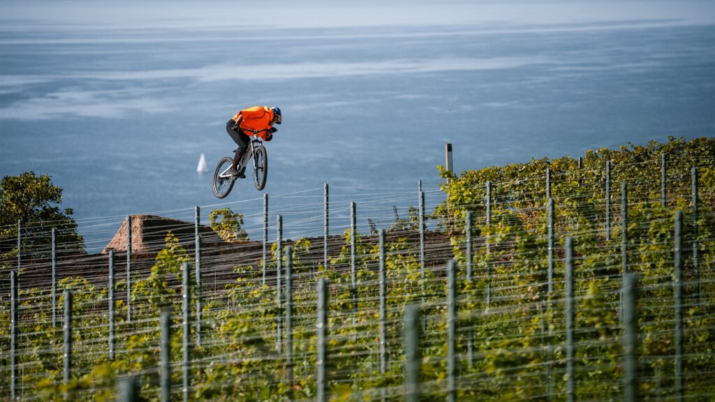Las terrazas de viñedos de Lavaux, repartidas por las laderas más bajas de la montaña entre el lago Lemán y los pueblos aledaños, sirvieron de escenario para esta aventura de conducción acrobática en bicicleta.