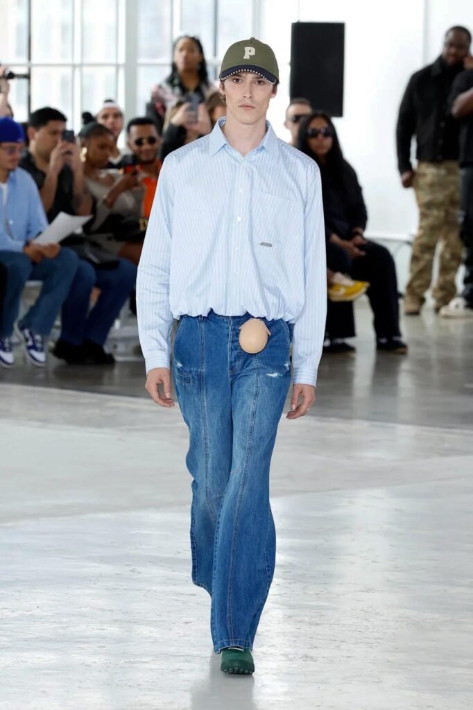 Trabajando sobre la estética del workwear, Li demuestra su fuerza en la estructura: pantalones militares verdes, chaquetas crop con hombros marcados que capturan autoridad. Se mezclan con estampados juguetones —como los lunares (polka dots) que puntean algunas combinaciones— exactamente lo necesario para romper la dureza sin romper la intención. ¿La pieza más memorable? Un pantalón militar profundo contrastado con un bubble pant de lunares. Duro y suave, serio pero con guiño.