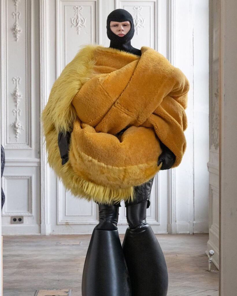 Las piezas statement de la pasarela fueron las botas gigantes de goma en colaboración con el diseñador Straytukay, diseñador popular por su trabajo con estructuras y volúmenes arquitectónicos junto a Owens.