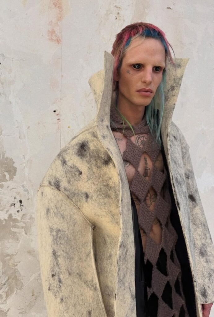 Una oda a la experimentación: cuero de toro negro brillante, kevlar cinco veces más resistente que el acero y telas trabajadas en talleres de Italia, Japón e India. La colección mezcla lo artesanal con lo industrial: máscaras de macramé, drapeados arquitectónicos y capas que evocan equipos de protección sin perder estilo. Cada textura invita a tocar, mirar y reinterpretar la función de la ropa en la vida moderna.