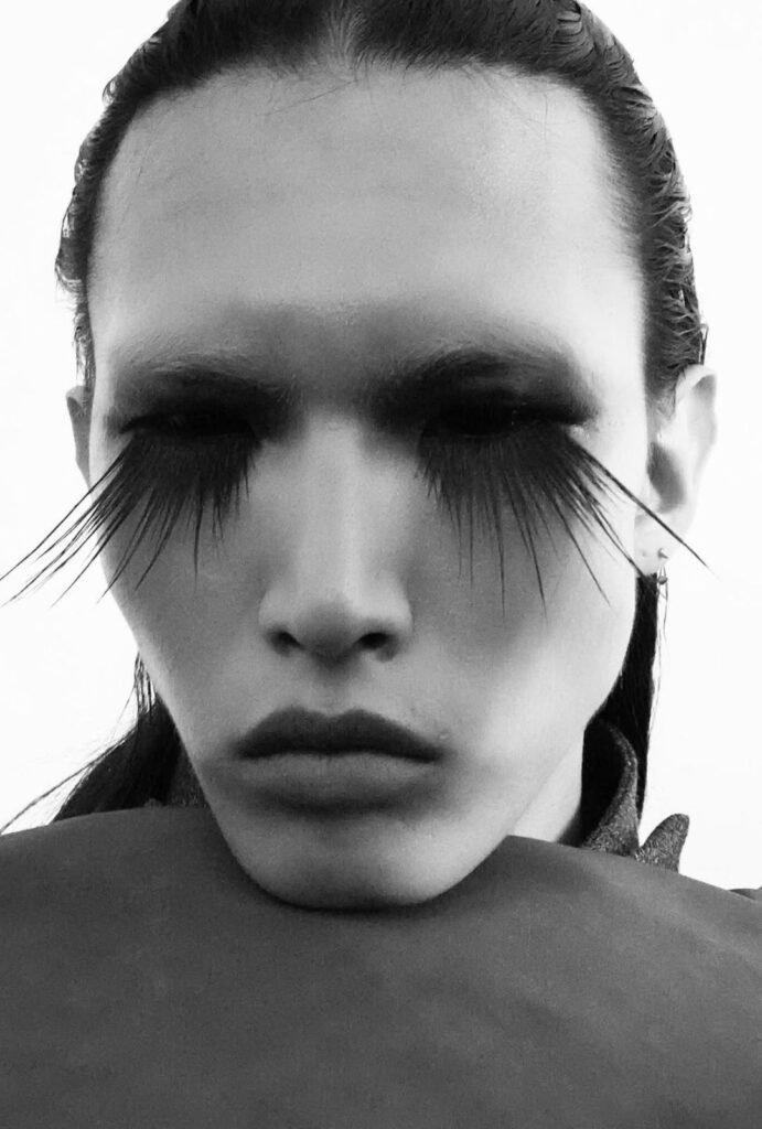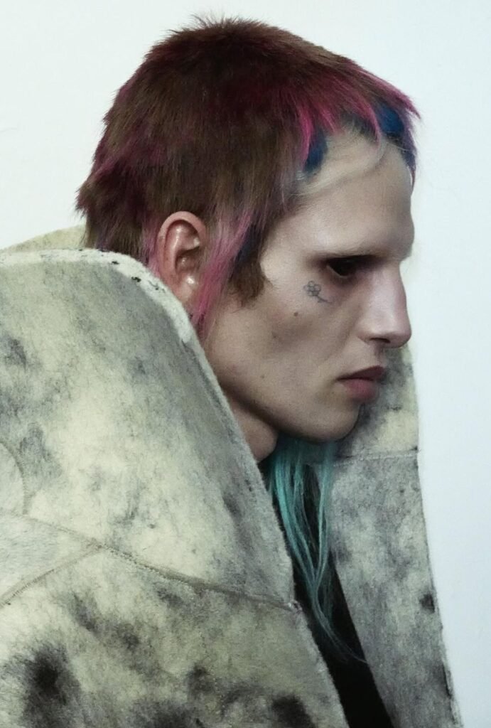 Los peinados siguen la misma lógica que las prendas: cabellos pintados a mano por Rick, flequillos largos y ralos que enmarcan el rostro, reflejos rosas y negros, tatuajes de estrellas fugaces en la cabeza y pestañas postizas dramáticas. Los lentes de contacto negros transforman las miradas en símbolos de rebelión refinada, mientras las texturas del cabello refuerzan la estética postapocalíptica y surrealista de la pasarela.