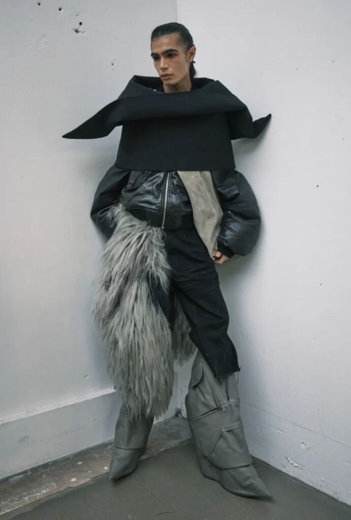 Absolutamente Rick Owens: cortes crudos, capas que se entrelazan como esculturas, abrigos que envuelven y pantalones que parecen fluir con el viento. Cada pieza de la colección TOWER propone un juego entre protección y libertad, entre amenaza y teatralidad. Las botas oversize y las plataformas cargo generan un contraste entre lo pesado y lo fluido, creando una narrativa visual que desafía la moda masculina clásica.
